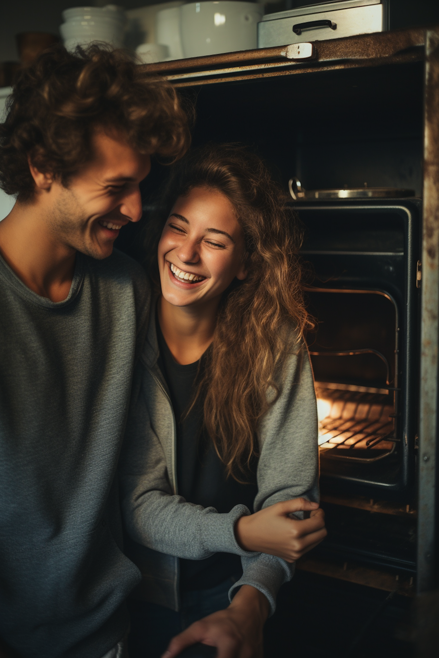 A joyful couple shares a laugh in a cozy kitchen, standing by an open oven with warm lighting.