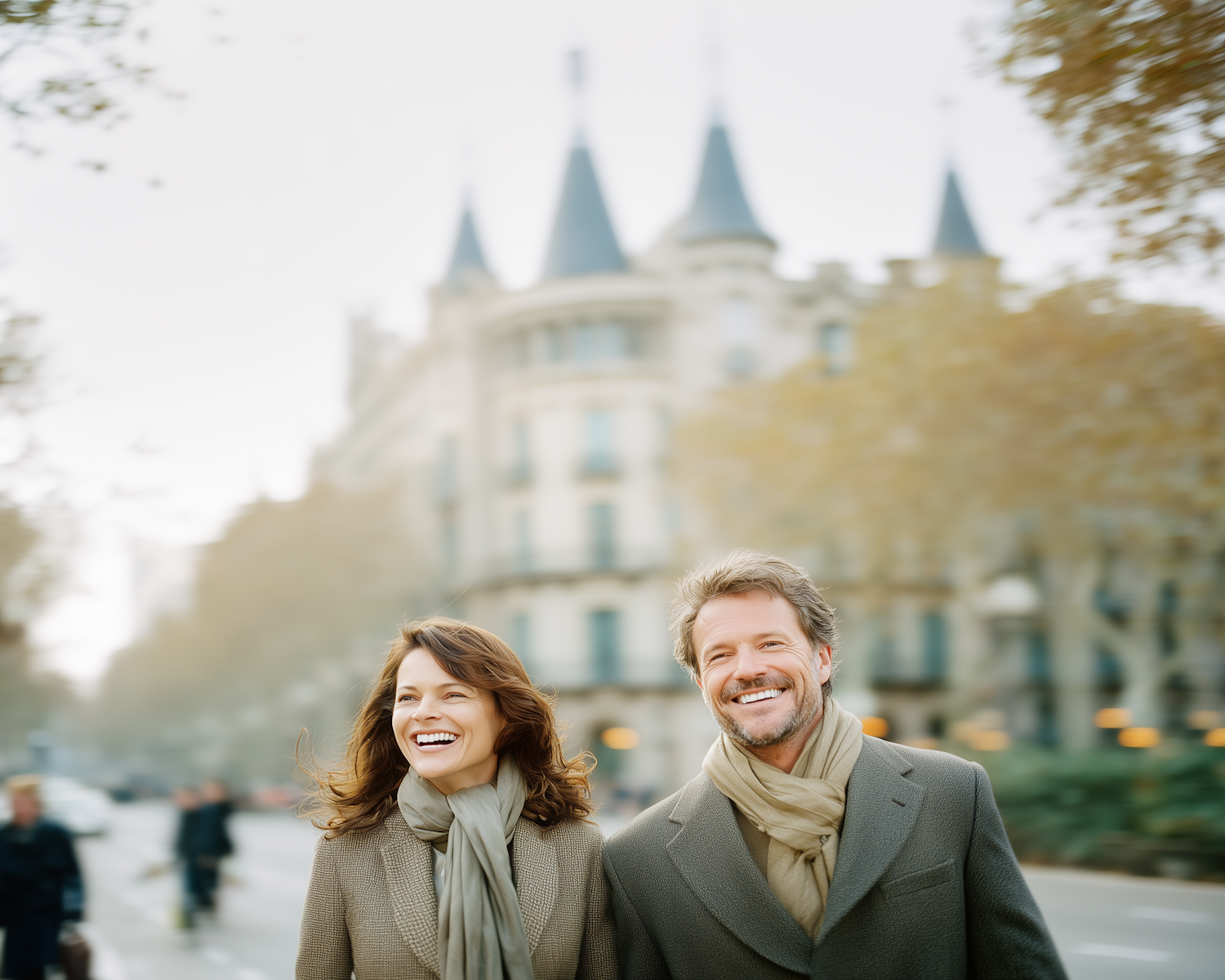 A cheerful couple walking in a city with a European-style building in the background, enjoying a crisp autumn day.