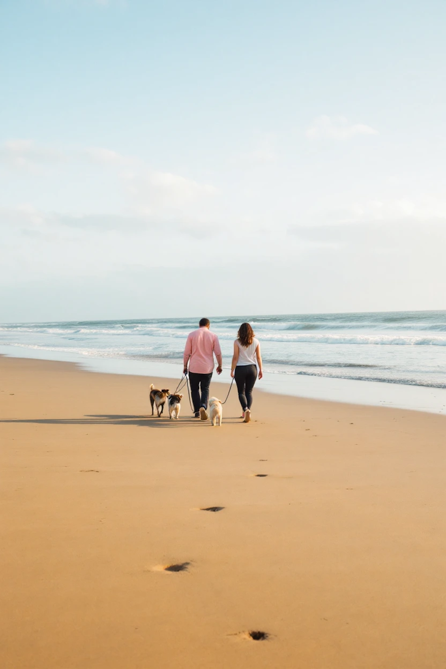 Couple walking three dogs on a serene beach, leaving footprints in the sand under a clear blue sky.
