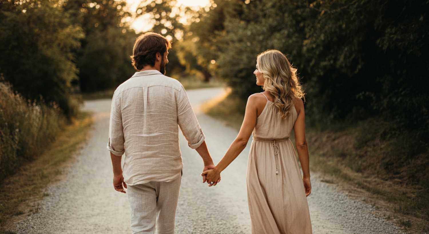 A couple walks hand in hand on a sunlit gravel path, surrounded by lush greenery, creating a serene and romantic atmosphere.