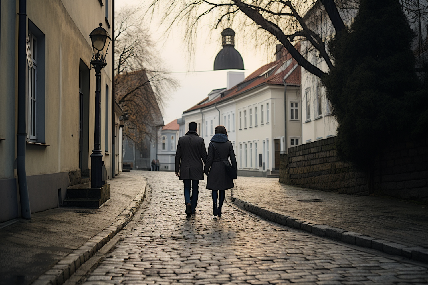 A couple strolls down a charming cobblestone street lined with historic buildings and bare trees, under a soft, overcast sky.