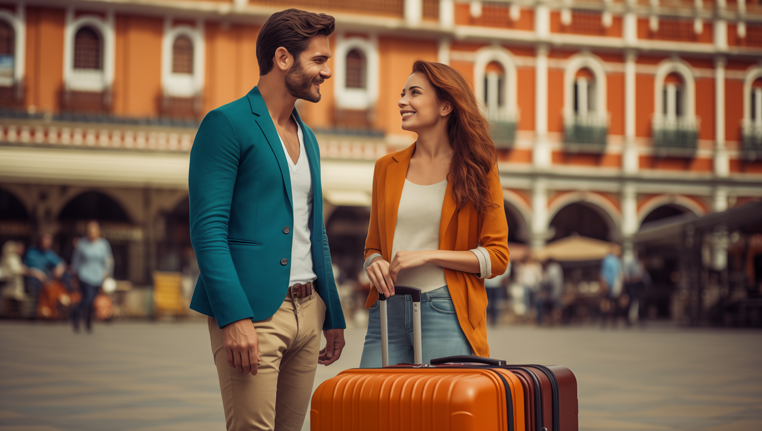 Stylish couple in vibrant urban setting with orange suitcase, teal and orange blazers, and European architecture in the background.