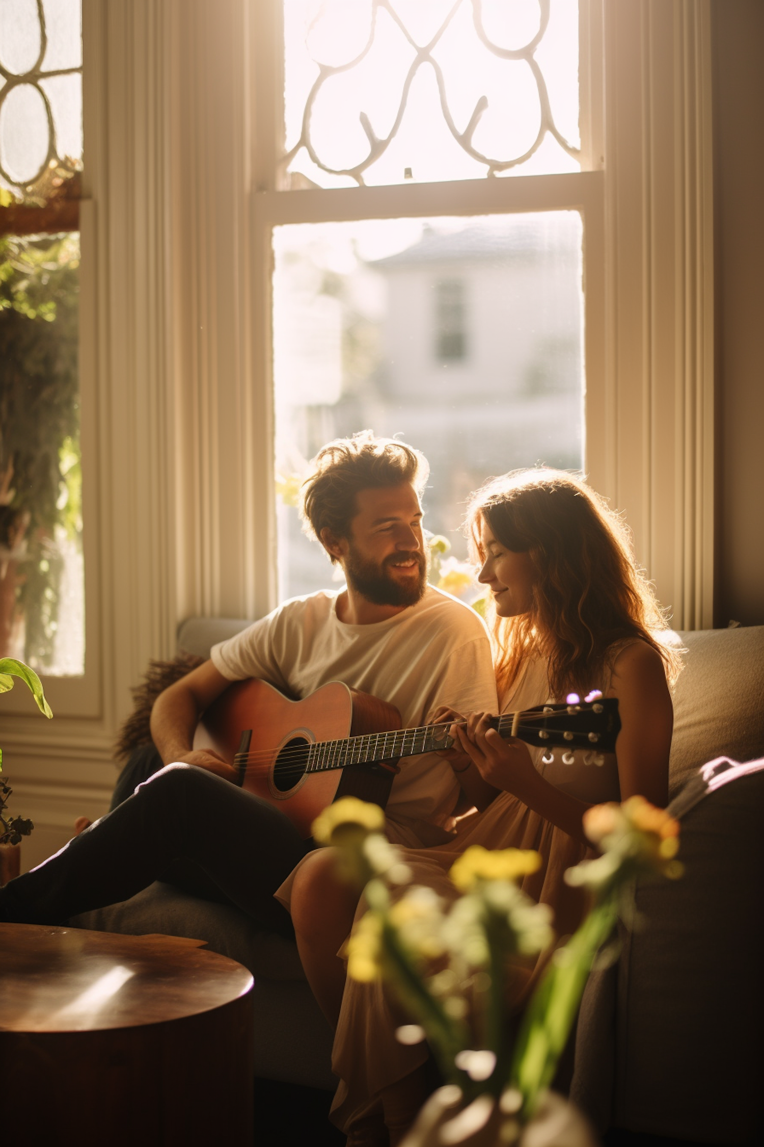 A couple enjoys a cozy moment with a guitar by a sunlit window, surrounded by warm tones and soft light.