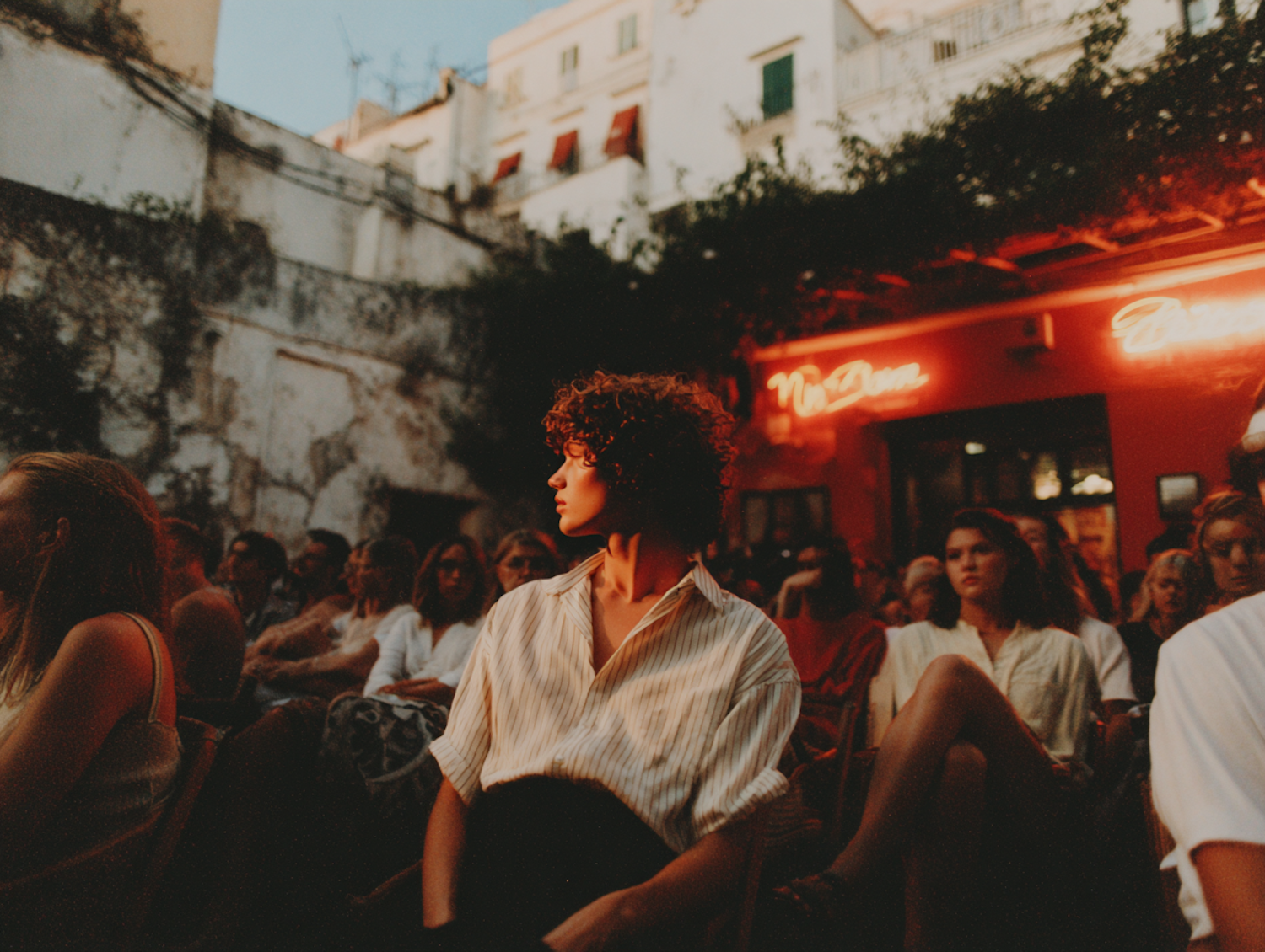 A person in a striped shirt sits among a crowd in a warmly lit outdoor setting, with a red neon sign and rustic walls in the background.
