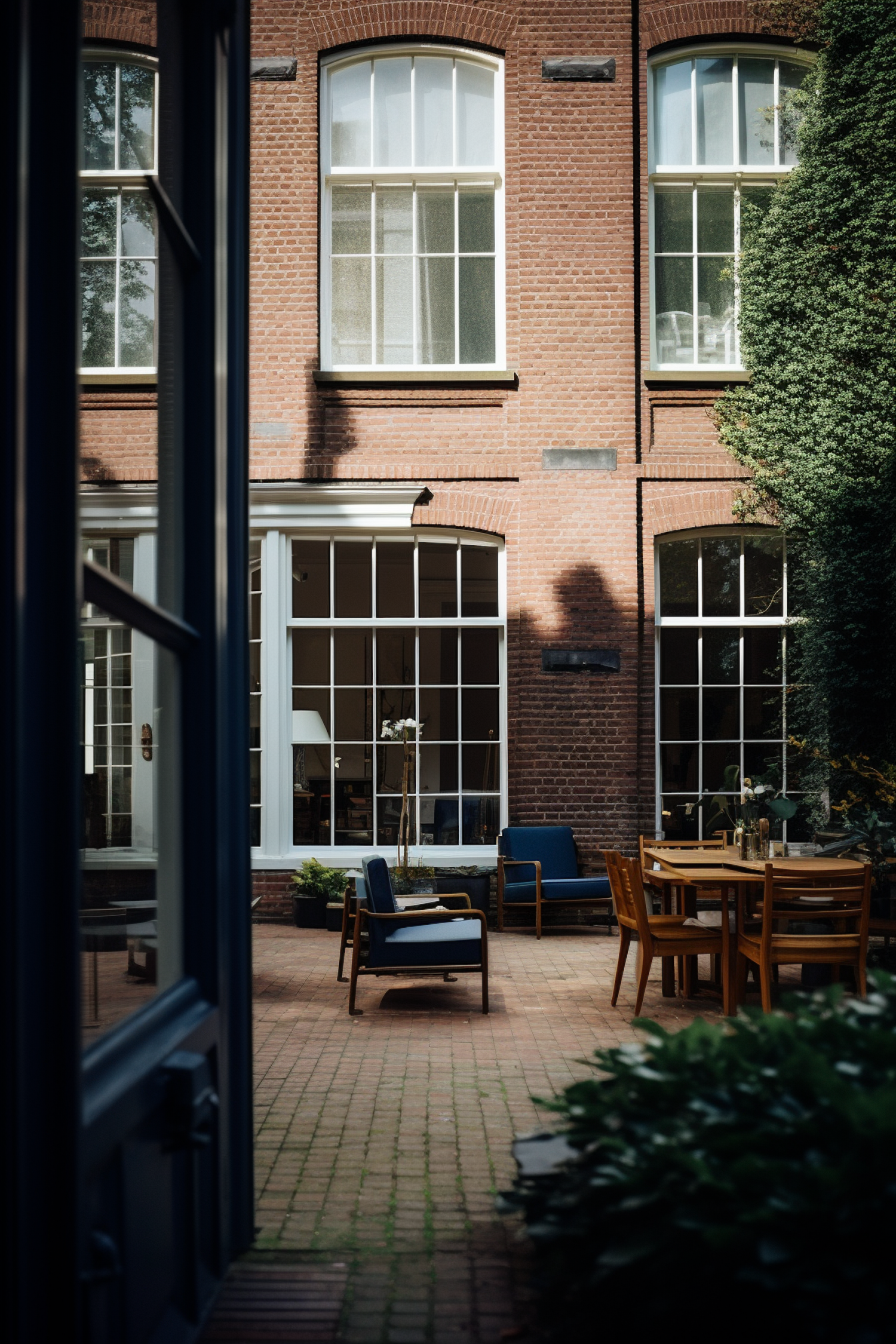 Charming courtyard with brick building, arched windows, wooden furniture, and lush greenery. A peaceful outdoor retreat.