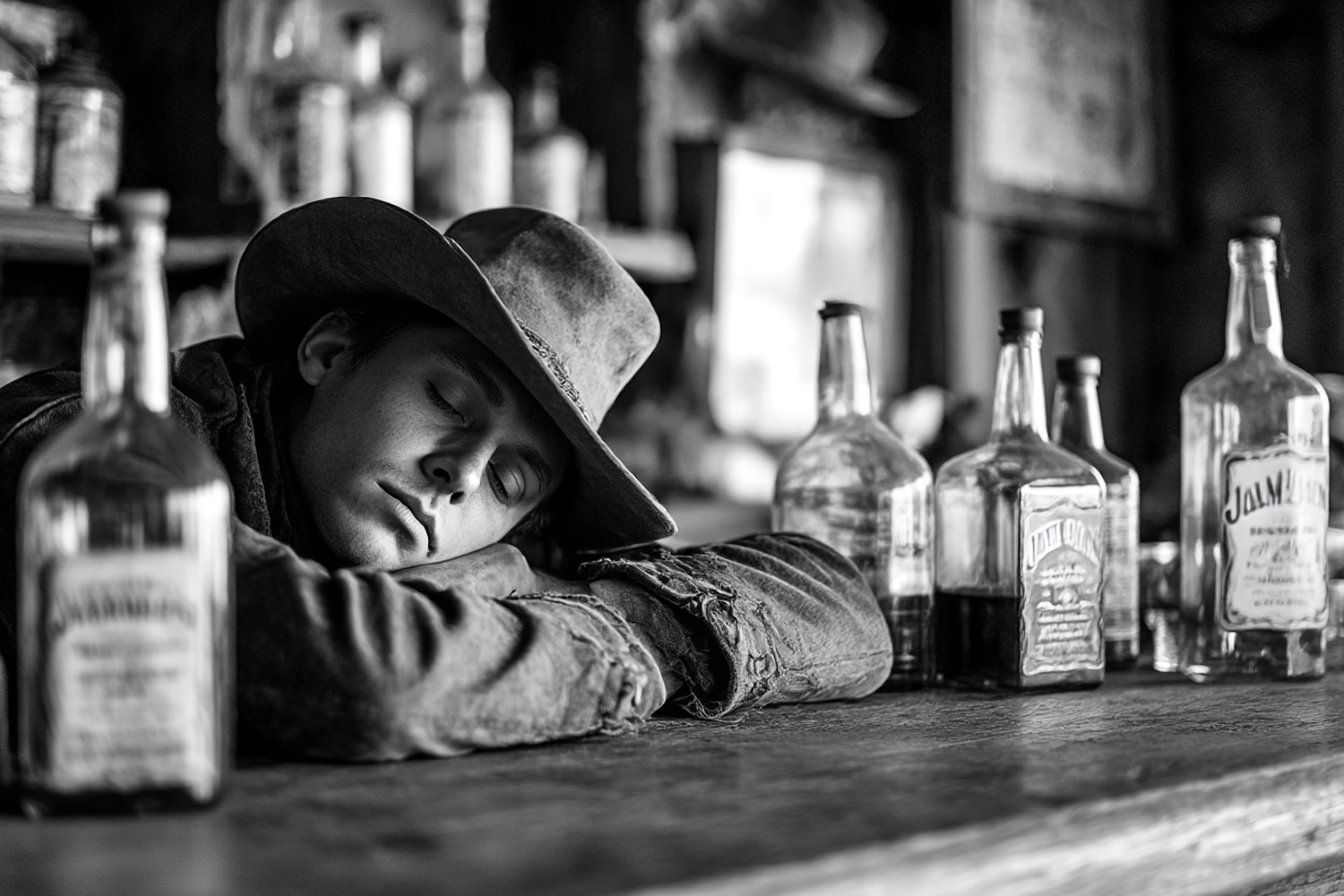 A black-and-white photo of a man in a cowboy hat resting on a bar counter surrounded by vintage bottles, evoking a rustic, nostalgic mood.