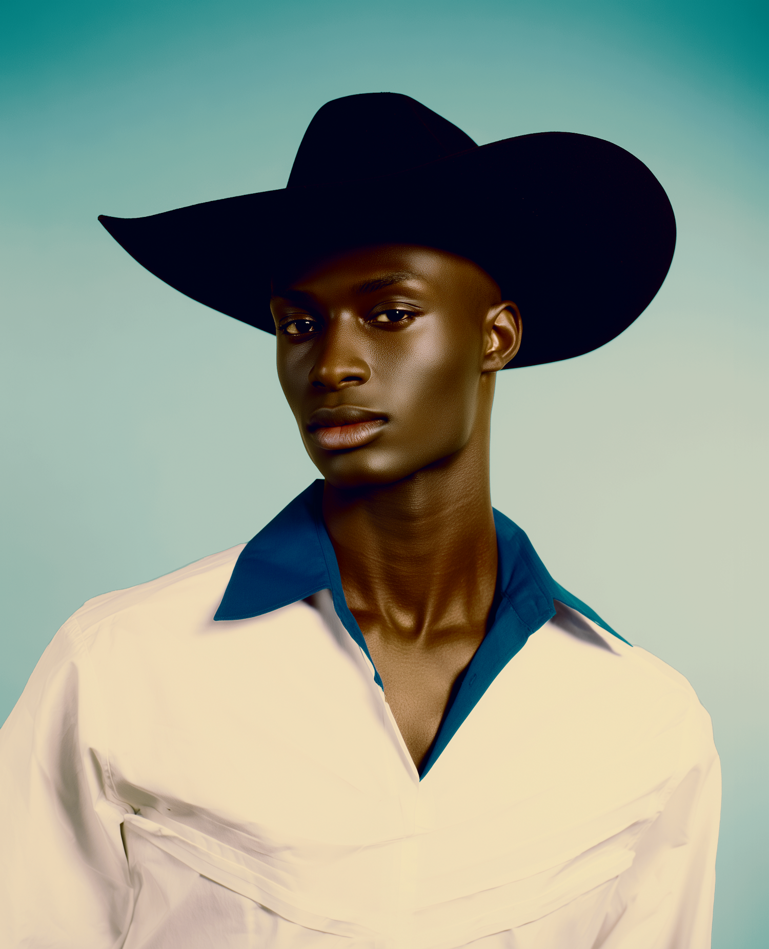 Stylish portrait of a person in a black cowboy hat and white shirt with a blue collar, set against a soft gradient background.
