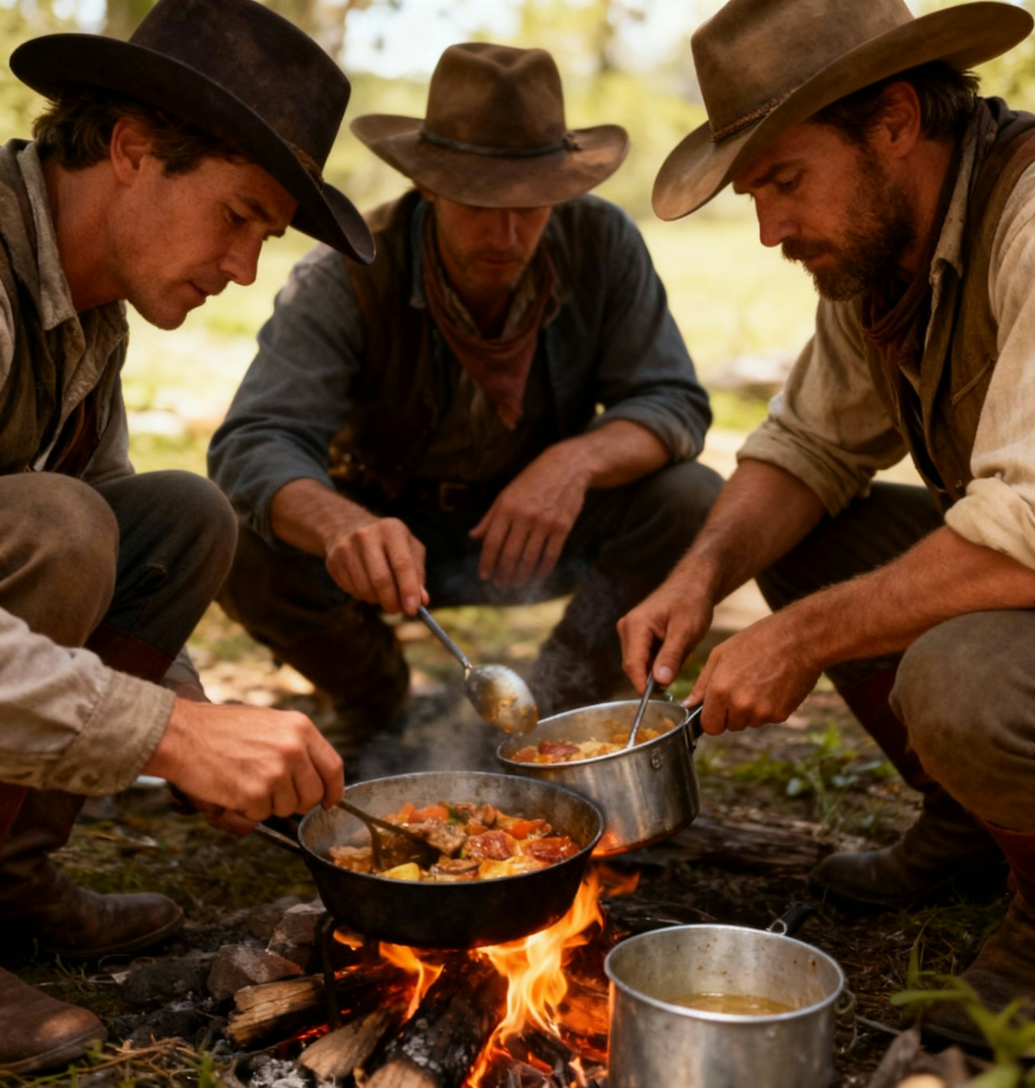 Three cowboys cooking a meal over a campfire in a rustic outdoor setting, showcasing camaraderie and traditional Western lifestyle.