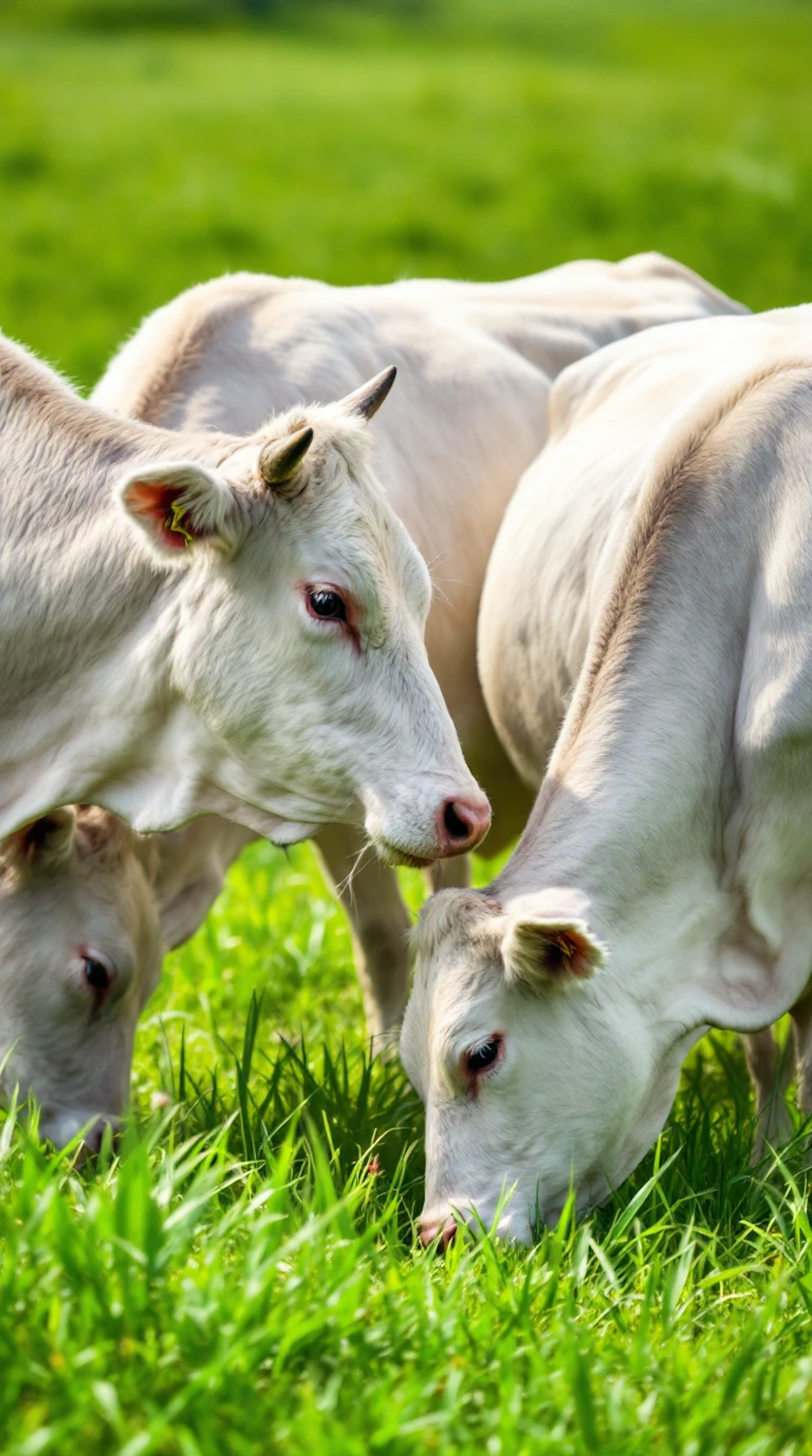 Light-colored cows grazing in a lush green field, basking in sunlight. Peaceful rural scene with vibrant greenery.