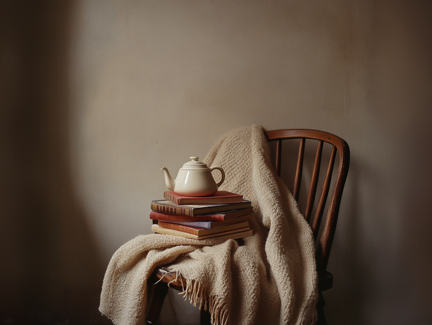 Cozy wooden chair with a beige blanket, stacked books, and a cream teapot, creating a warm, inviting reading nook.