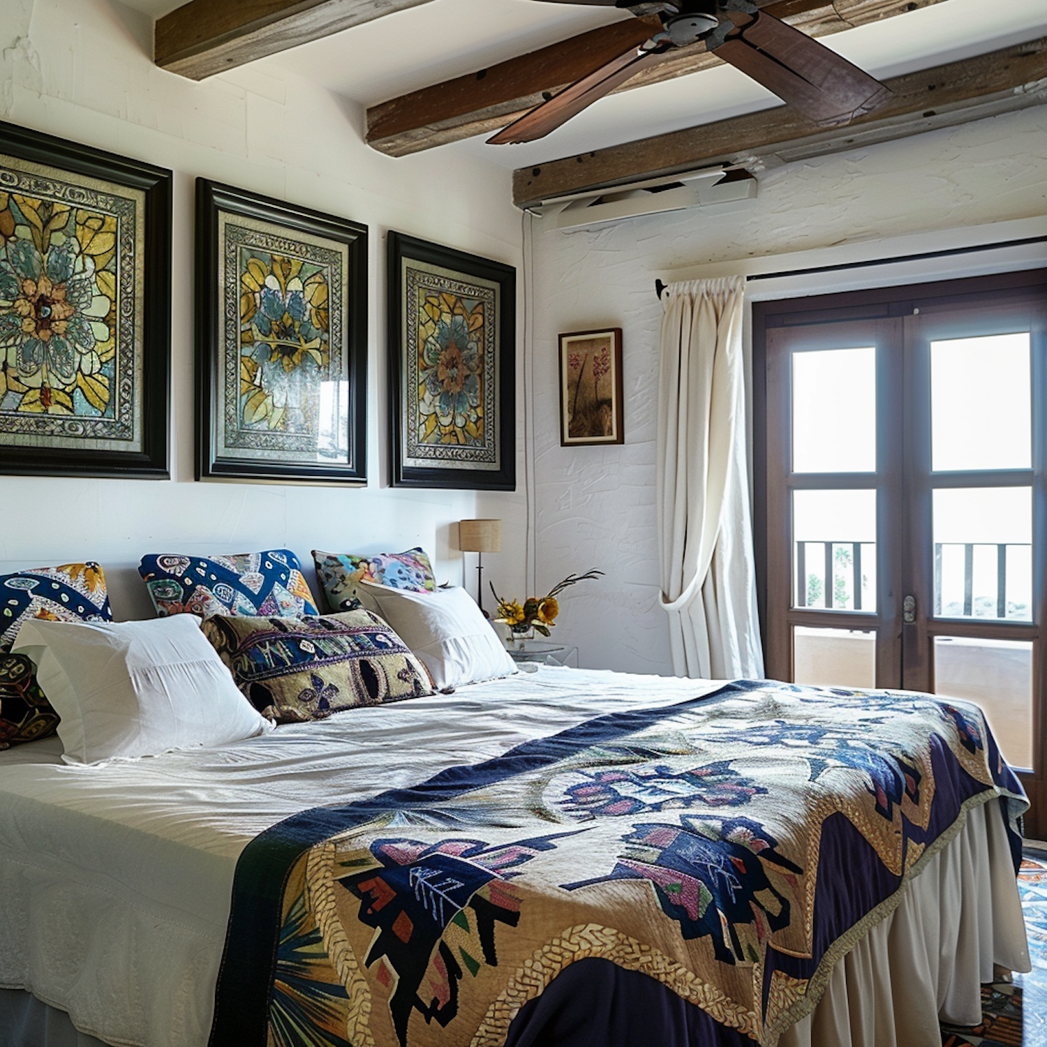 Cozy bedroom with rustic charm, featuring a large bed, colorful quilt, floral artwork, and natural light from French doors.