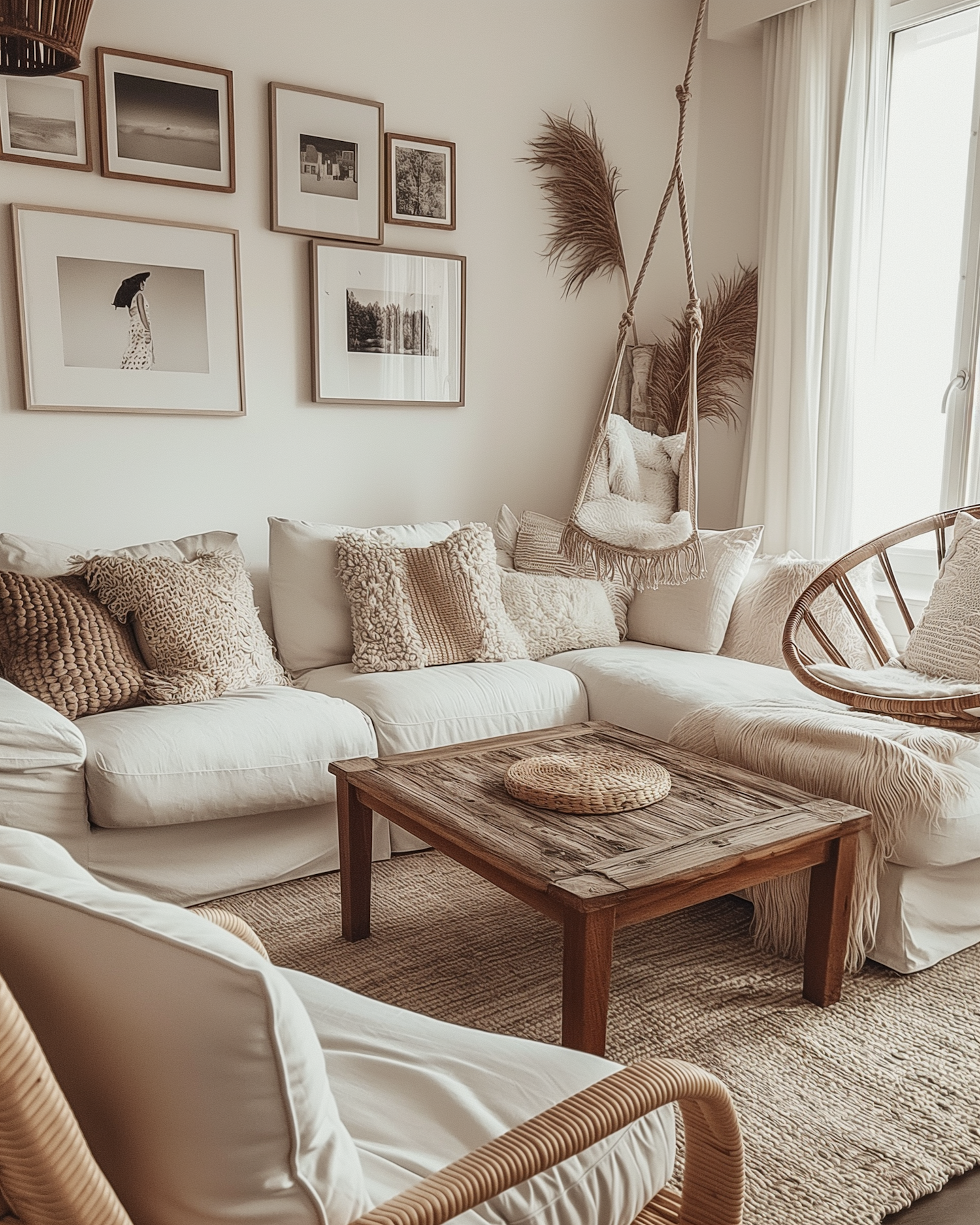Cozy living room with white sofa, rustic coffee table, hanging chair, and framed art. Neutral tones create a warm, inviting atmosphere.