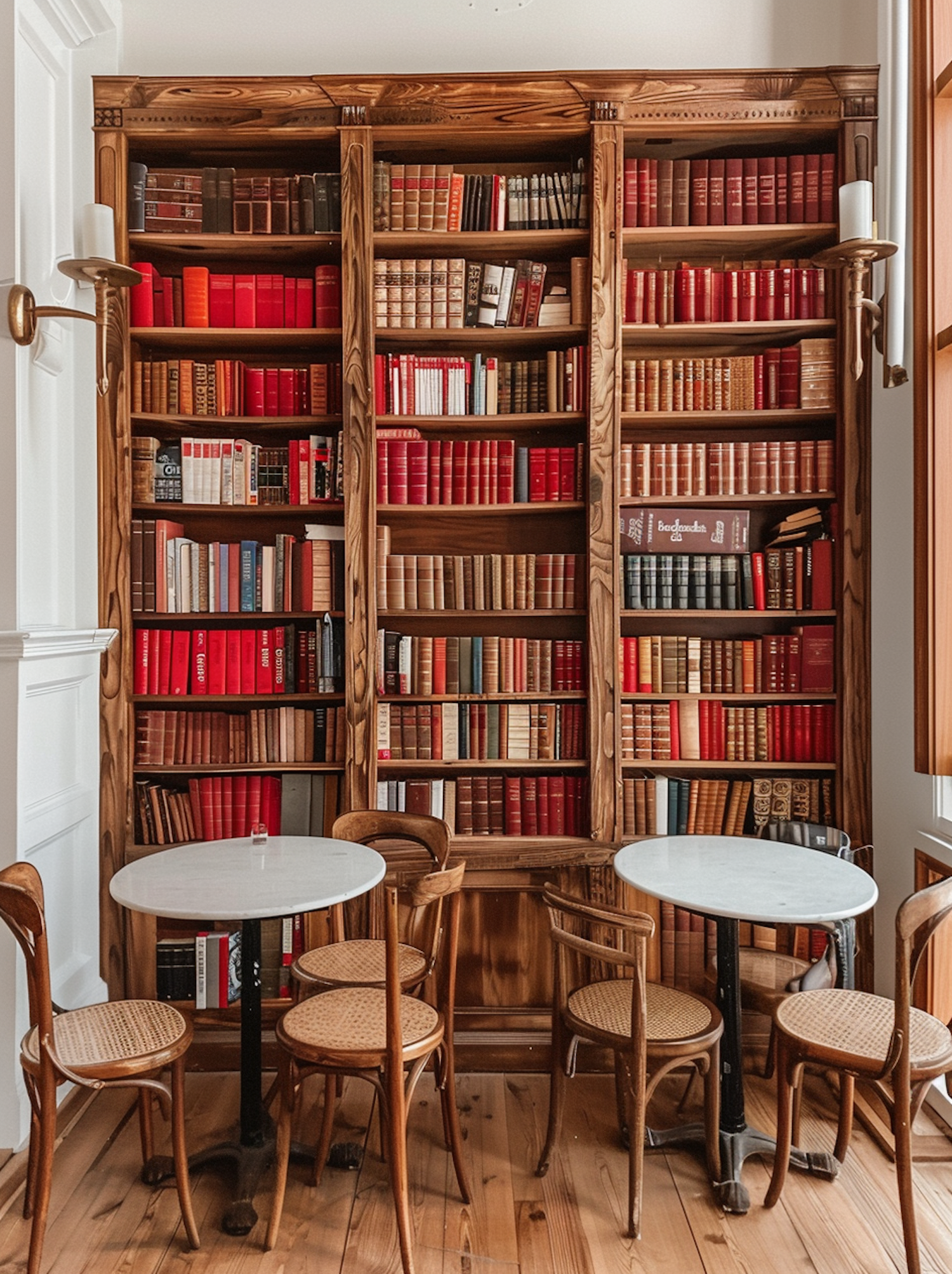 Cozy library with wooden shelves, red and brown books, marble tables, and wooden chairs. Warm, inviting atmosphere with natural light.