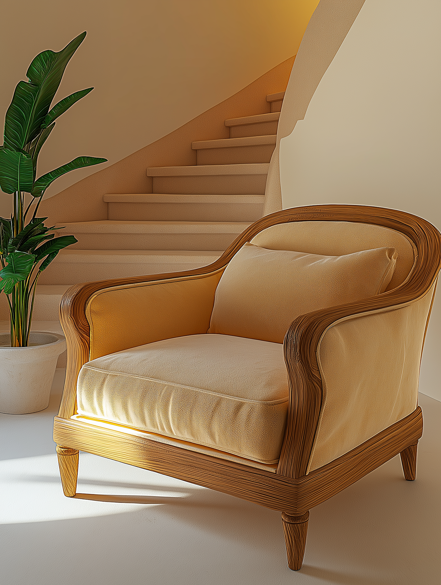 Elegant beige armchair with wooden frame in a warmly lit room, complemented by a green plant and a curving staircase.