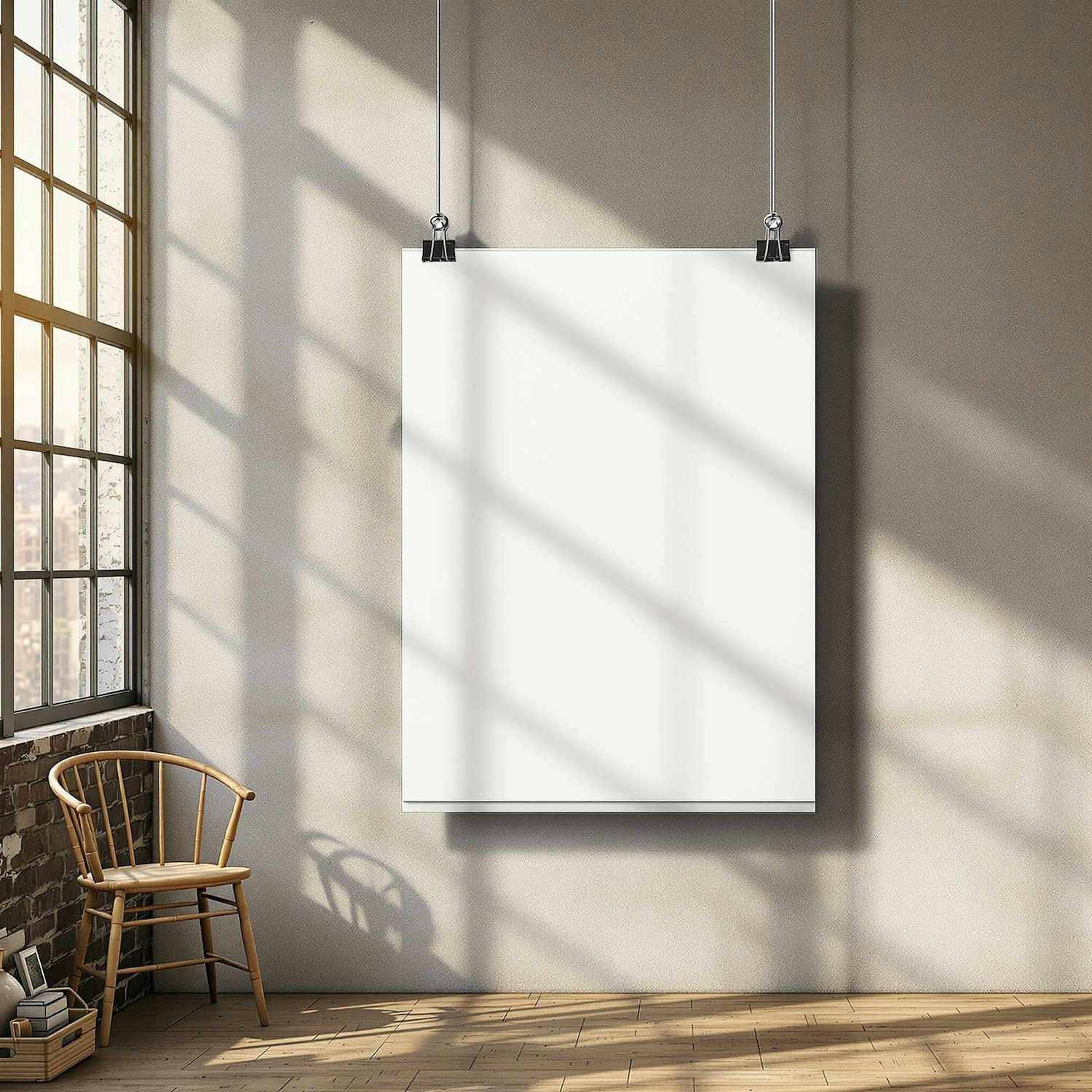 A minimalist modern poster mockup featuring a blank A3 frame suspended by two metal clips from a thin wire. The setting is an industrial yet artistic loft space with textured concrete walls, large factory-style windows casting dramatic shadows, and scattered vintage objects in the background. The floor is wooden, warm-toned, and slightly worn. The frame casts a natural soft shadow on the wall. Golden hour lighting with dust particles floating in the air. No reflections or text in the frame.