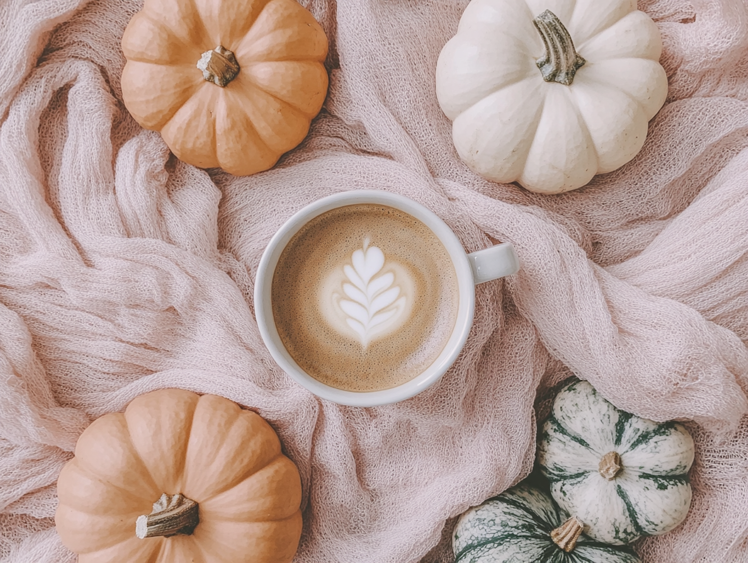 Cozy autumn scene with a latte surrounded by pumpkins on a soft pink fabric, evoking warmth and seasonal charm.
