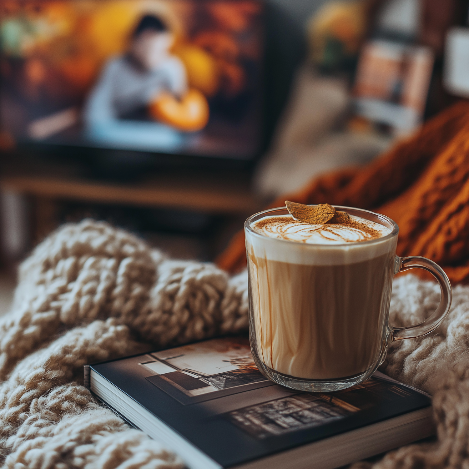 Cozy autumn scene with a latte on a book, knit blanket, and blurred TV in the background. Warm, inviting colors enhance the mood.