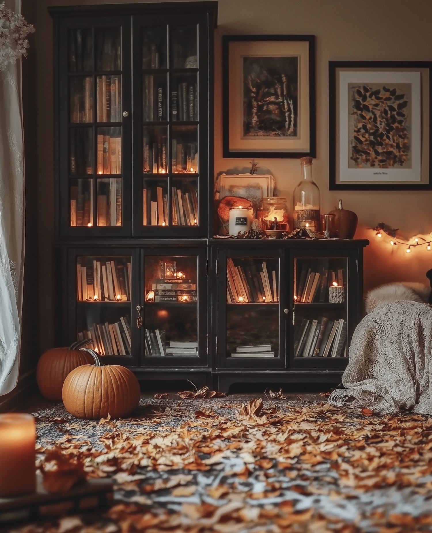 Cozy autumn room with a dark bookshelf, candles, pumpkins, and dried leaves. Warm lighting enhances the seasonal ambiance.