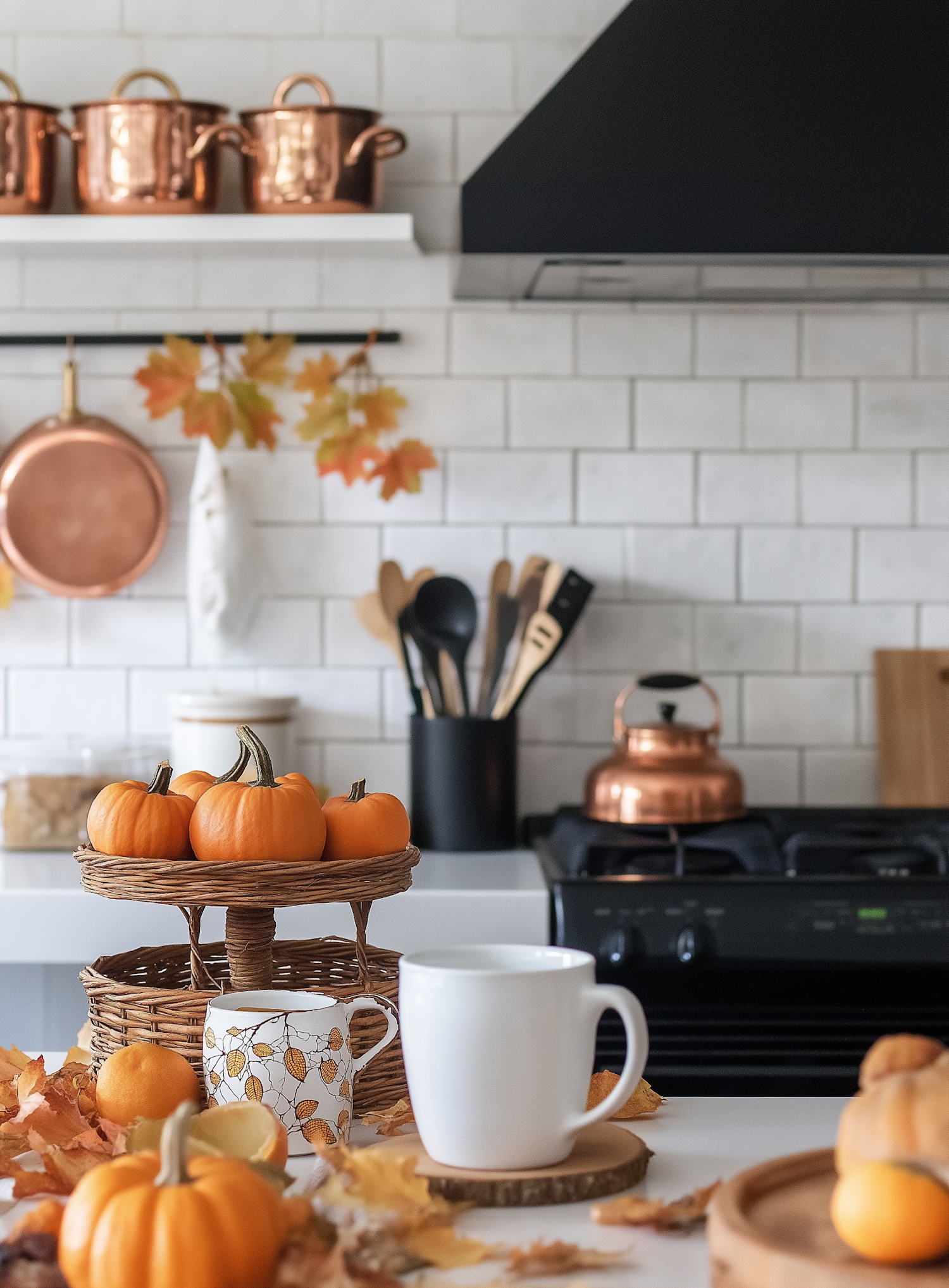 Cozy fall-themed kitchen with pumpkins, copper accents, and autumn leaves on a white countertop and subway tile backsplash.