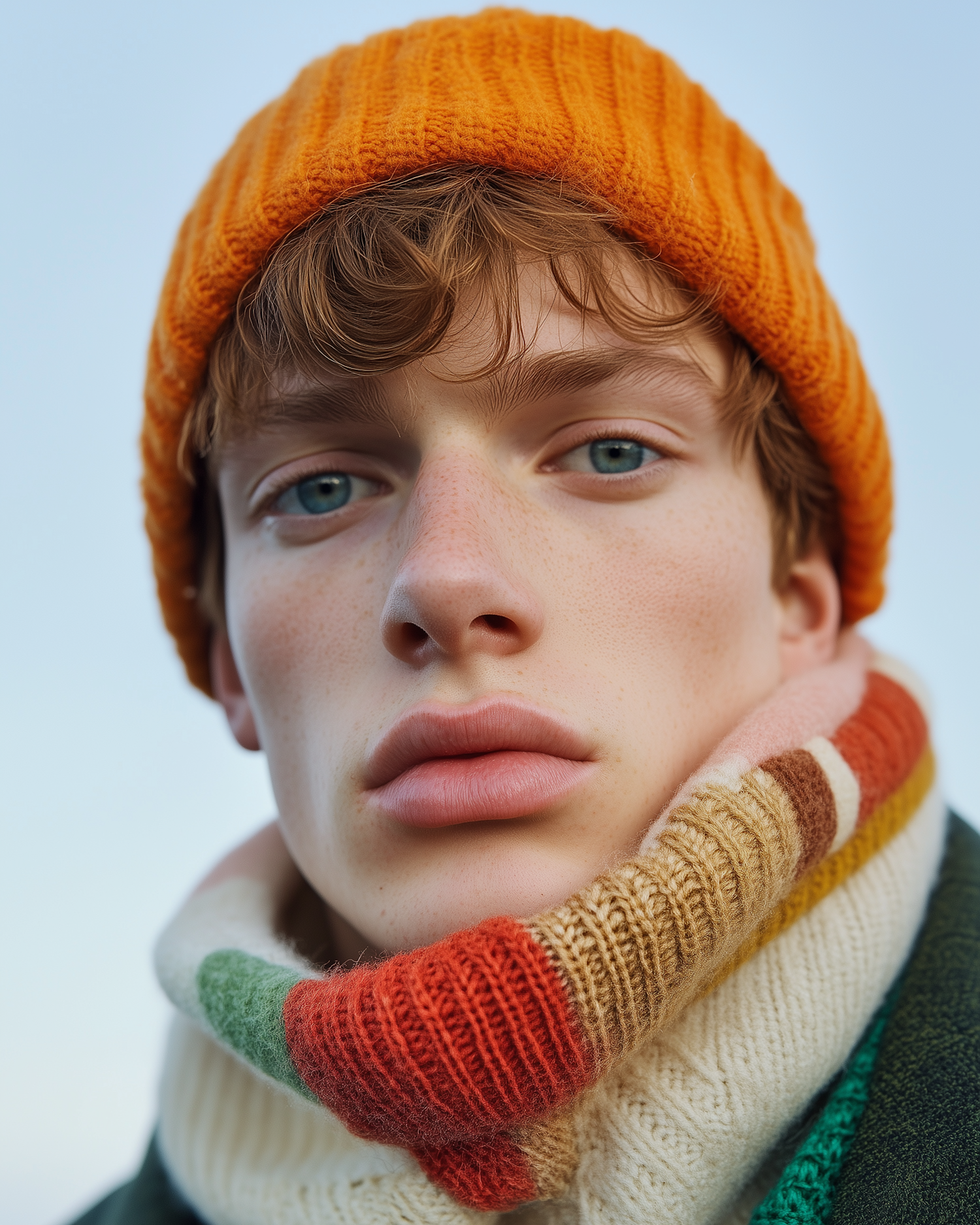Young man with ginger hair in an orange beanie and colorful scarf, gazing directly at the camera against a soft sky background.