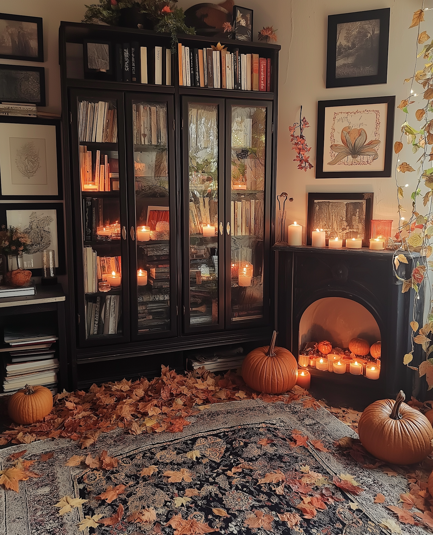 Cozy autumn room with candles, pumpkins, and scattered leaves. Black bookshelf and fireplace create a warm, inviting seasonal vibe.