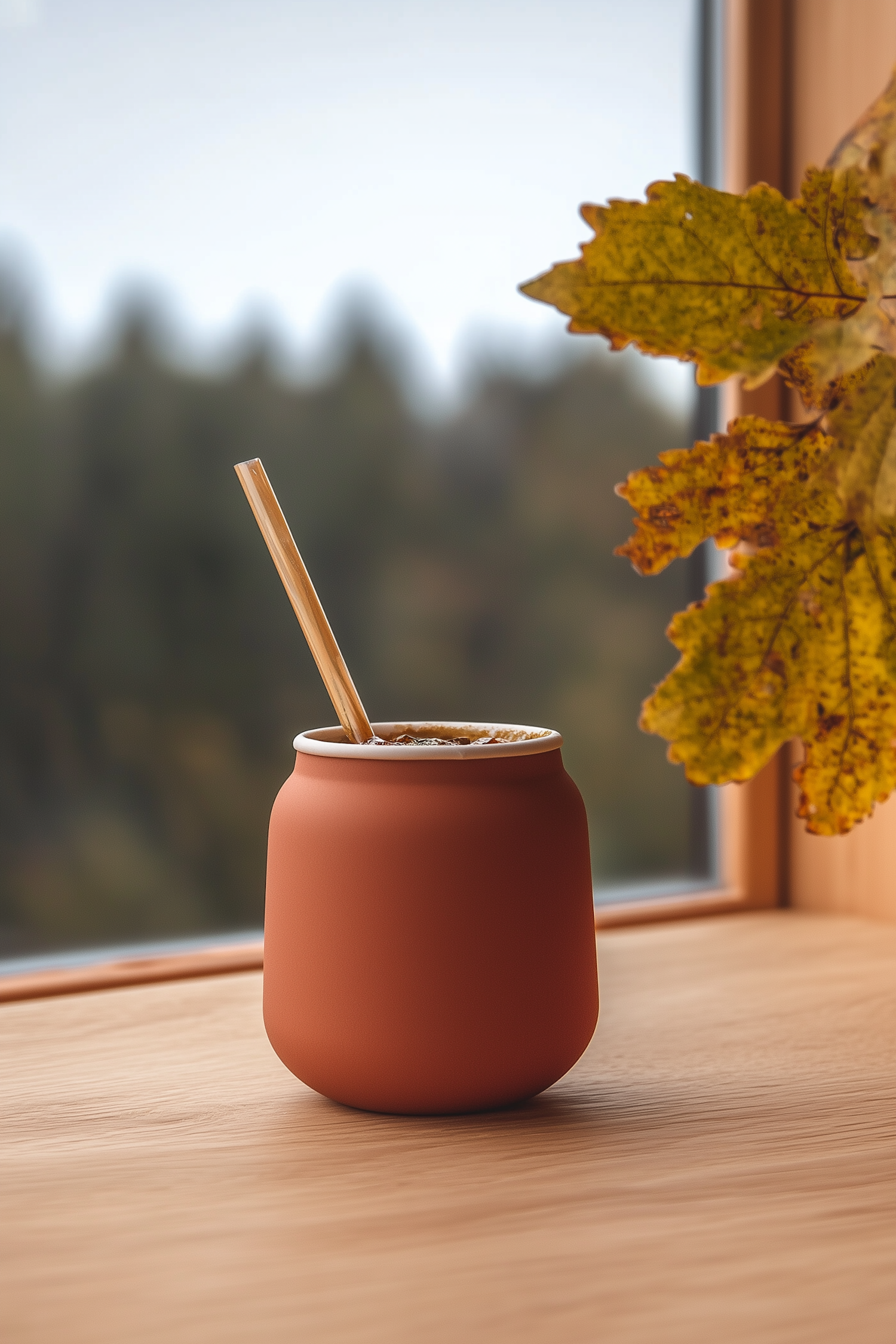 Terracotta cup with a bamboo straw on a wooden windowsill, framed by autumn leaves and a blurred forest view in the background.
