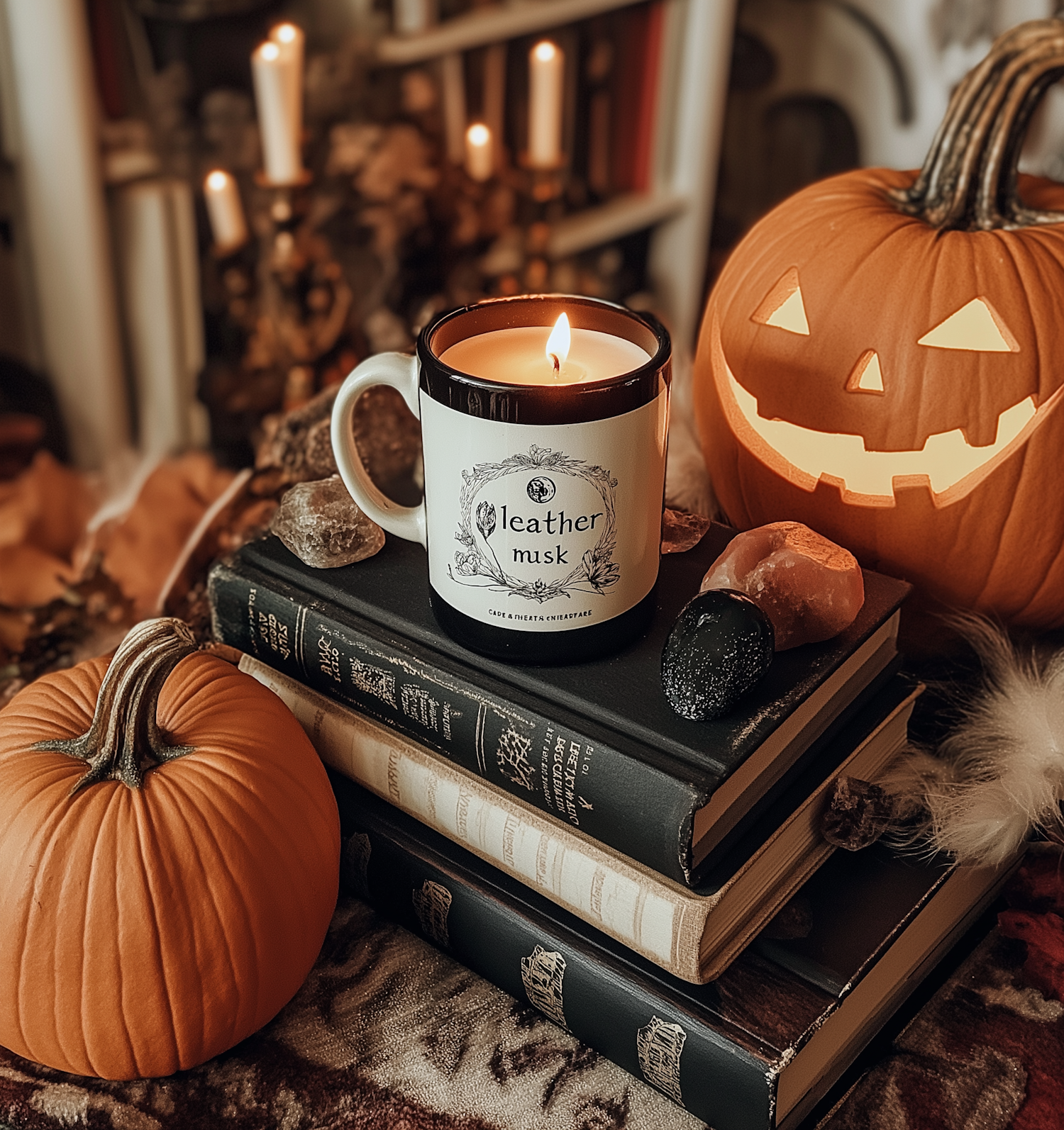 Cozy autumn scene with a lit 'leather musk' candle, vintage books, pumpkins, and crystals, creating a warm, festive ambiance.