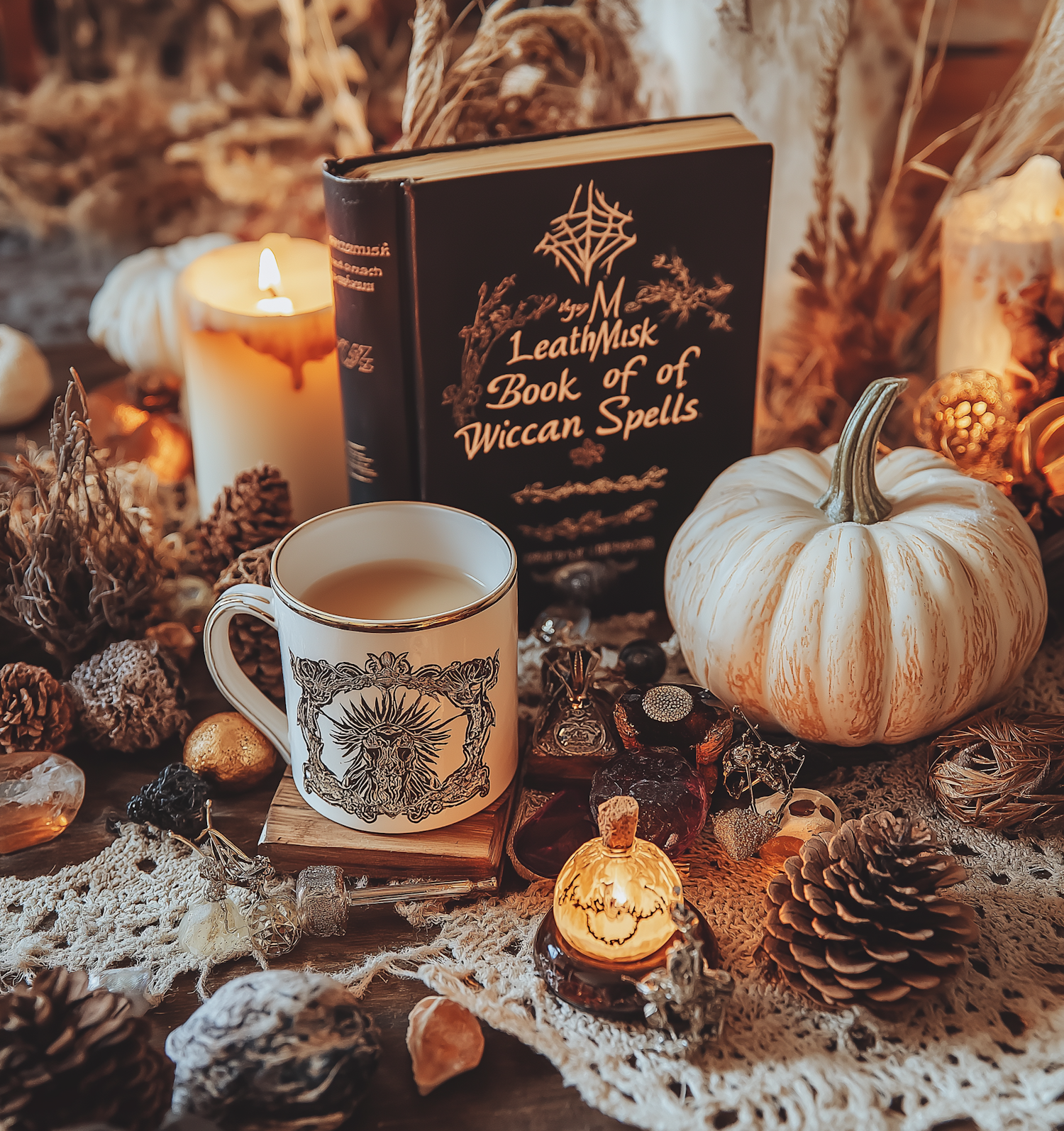 Cozy Wiccan-themed autumn setup with a spellbook, white pumpkin, and warm tea amidst candles and pinecones.