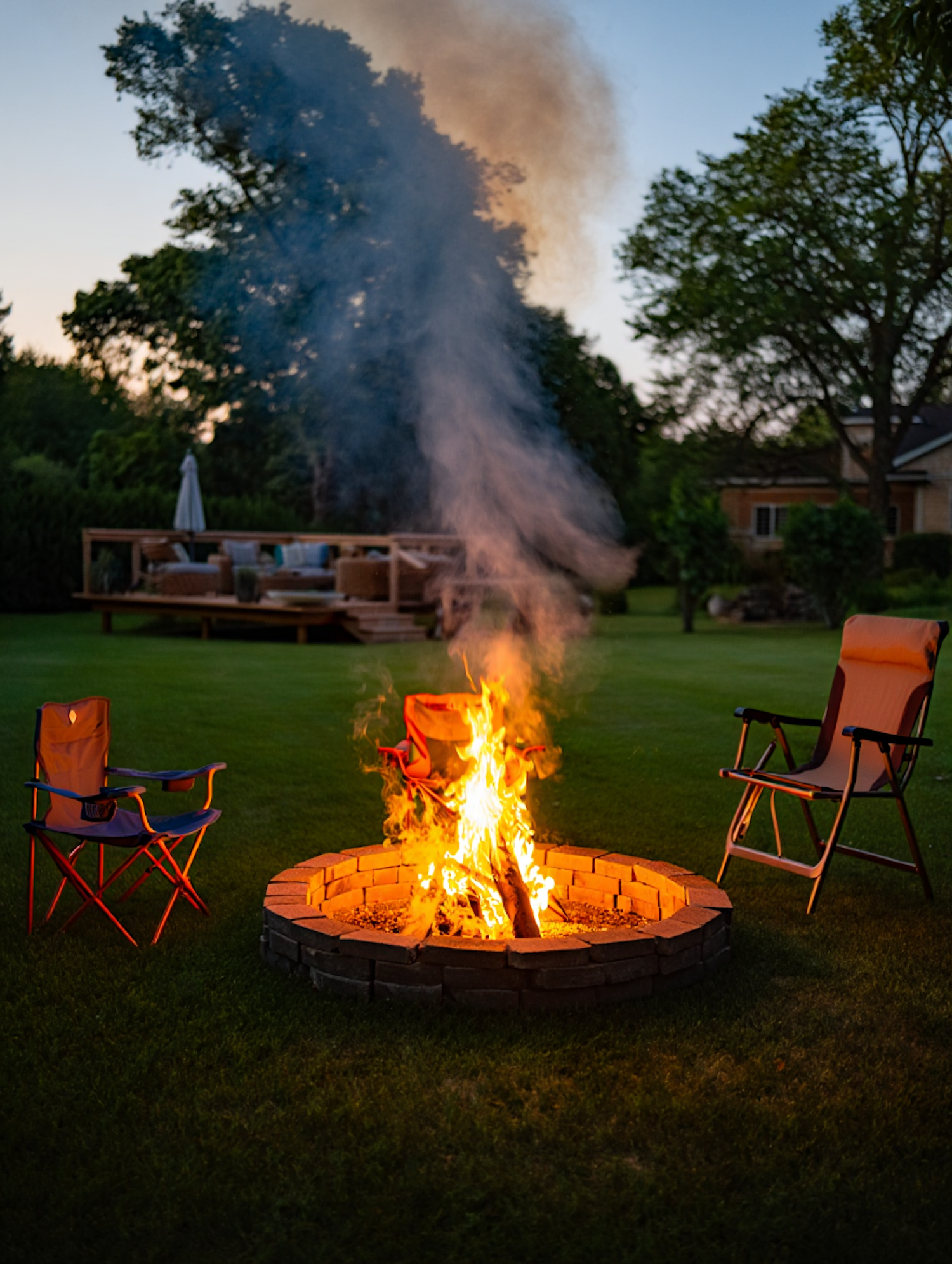 A campfire at dusk surrounded by chairs on lush grass, framed by trees and a cozy patio area in the background. Perfect outdoor retreat.
