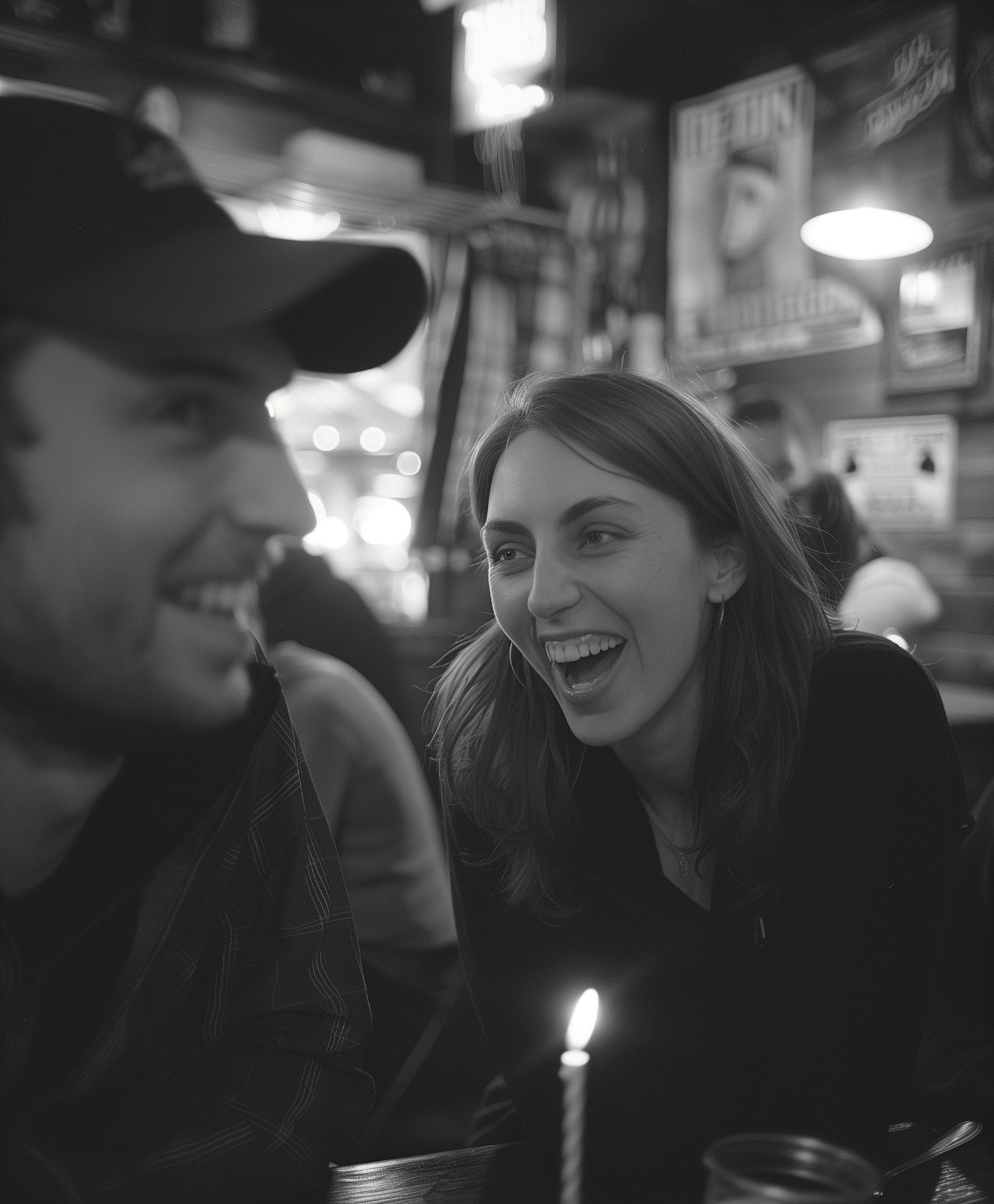 Black and white photo of two people laughing in a cozy, dimly lit setting with a candle on the table.
