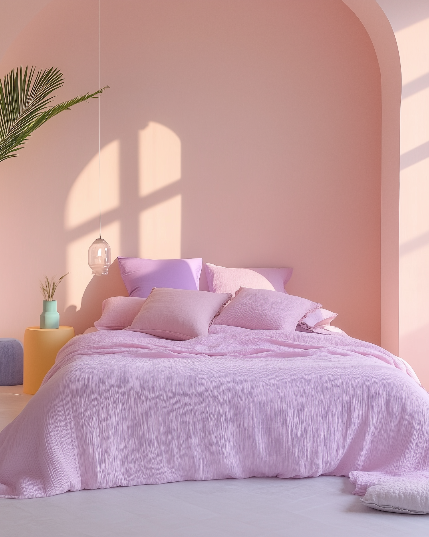 Soft pastel bedroom with pink bedding, lavender pillows, and a peach arched wall. Minimal decor includes a vase, plant, and pendant light.