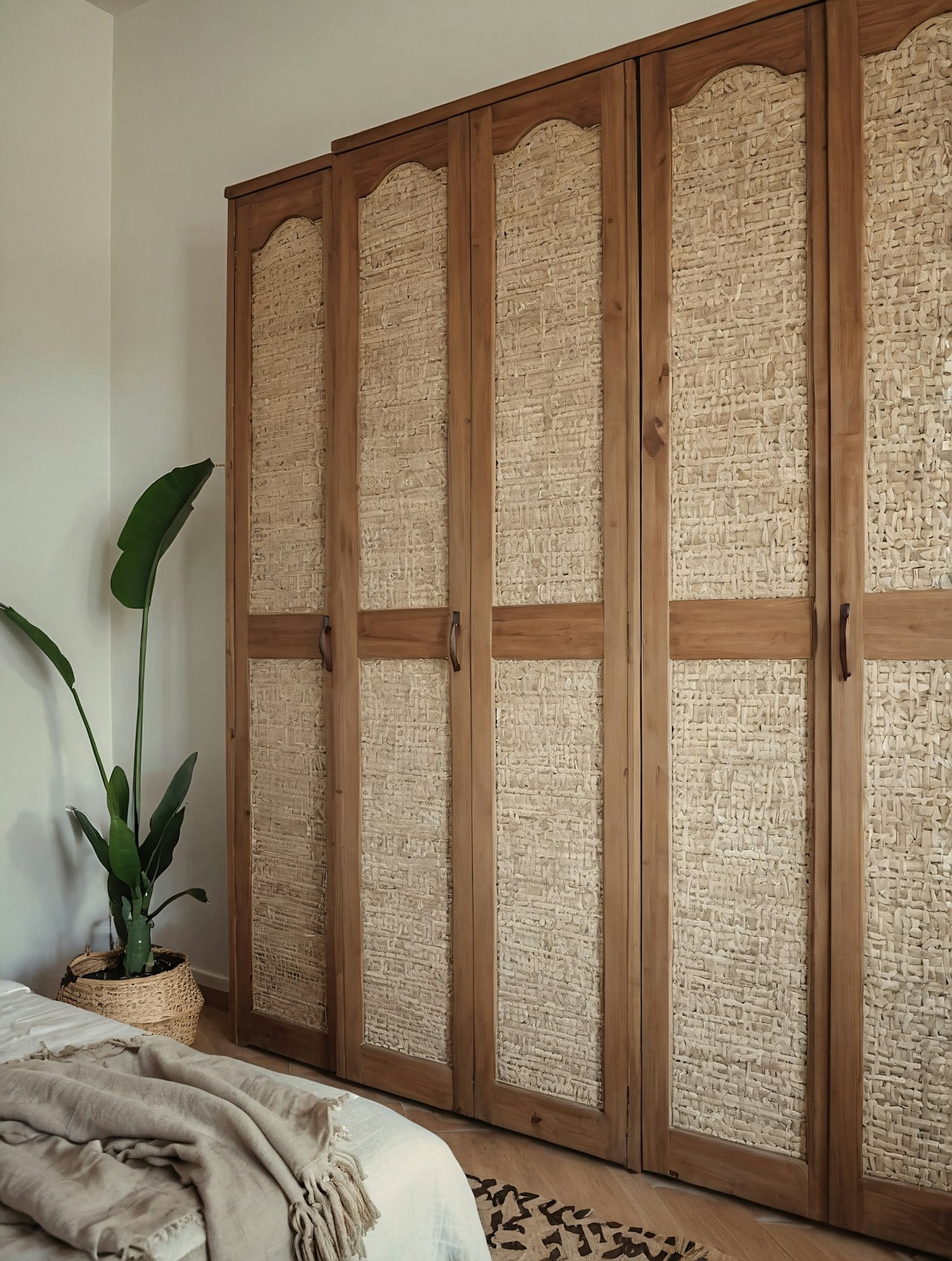 Rustic wooden wardrobe with rattan panels, a cozy bed with beige bedding, and a green plant in a woven basket for a natural, earthy vibe.