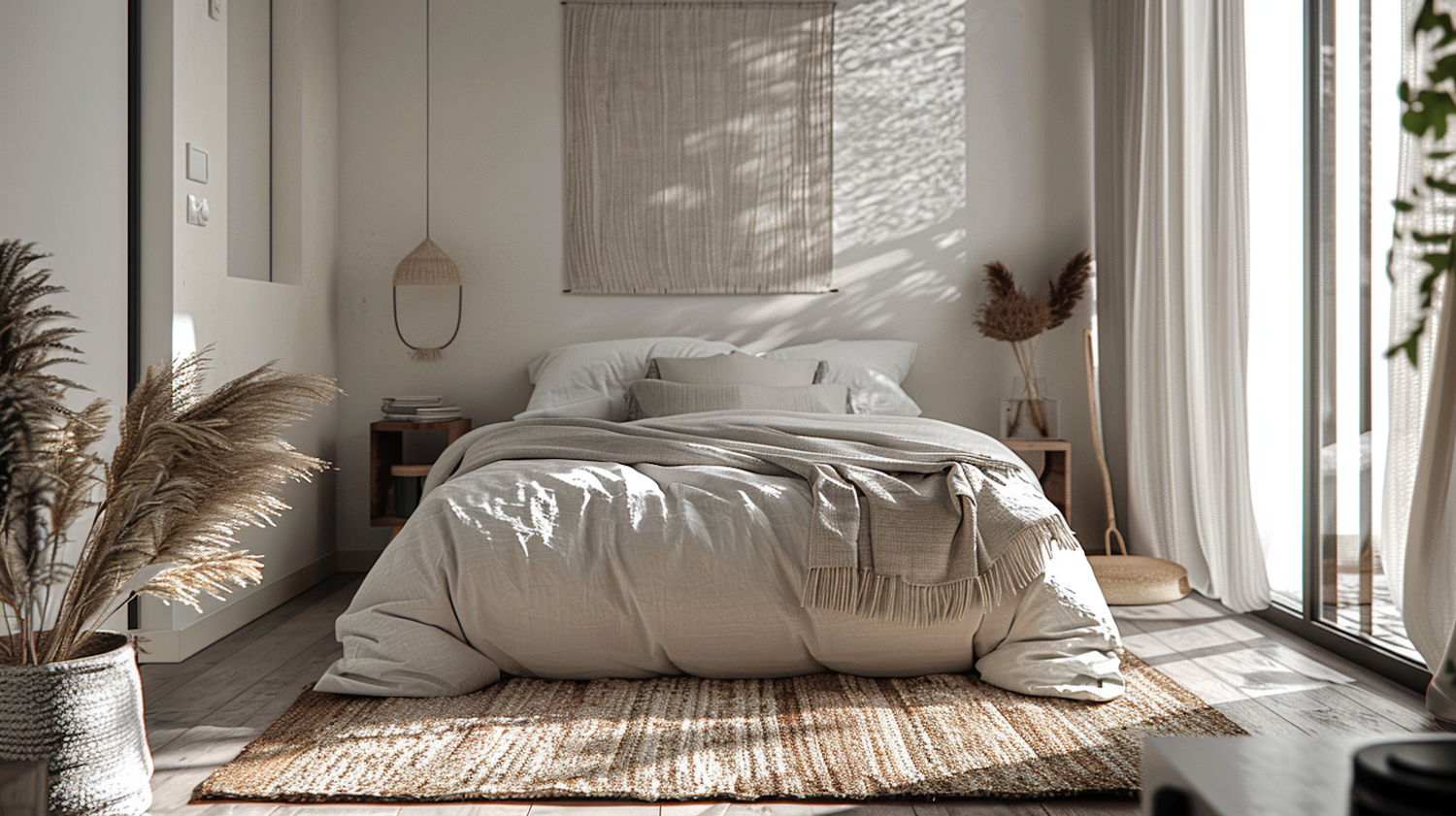 Cozy bedroom with neutral tones, soft bedding, and natural light. Features wooden accents, dried plants, and a woven rug.