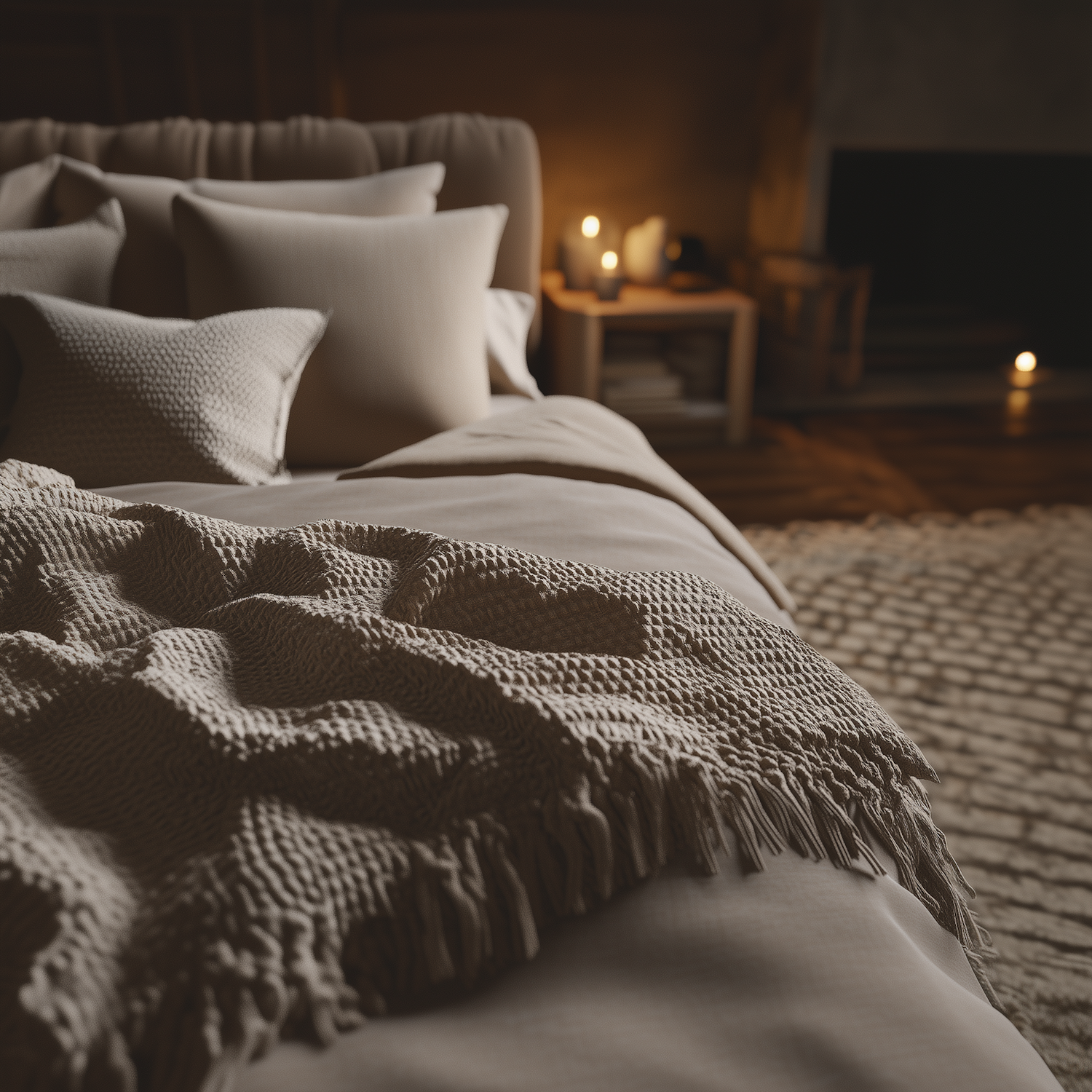 Cozy bedroom with a beige bed, textured pillows, and soft lighting from candles, creating a warm and inviting atmosphere.