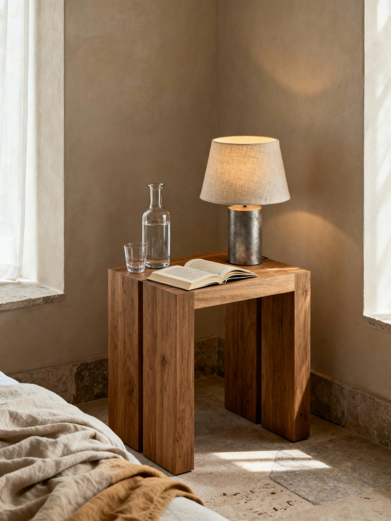 Nordic interior photography, shot in natural daylight — serene and contemplative atmosphere. Soft diffused light from side windows, gentle shadows, warm neutral palette with tones of beige, tan, and muted brown. Use raw and tactile materials like oak wood, linen, stone, brushed metal. Minimal composition with air and negative space. Realistic photo with subtle grain, no overexposure. Architectural framing, calm and timeless design aesthetic inspired by FRAMA — quiet luxury, Scandinavian minimalism, sensory stillness. A small wooden bedside table with straight, architectural lines. On it, a carafe of water with a glass, a linen-covered lamp emitting soft light, and an open book. The bed’s edge with linen sheets appears slightly in frame, adding warmth. The scene feels intimate, dimly lit, and calm — a moment before rest.