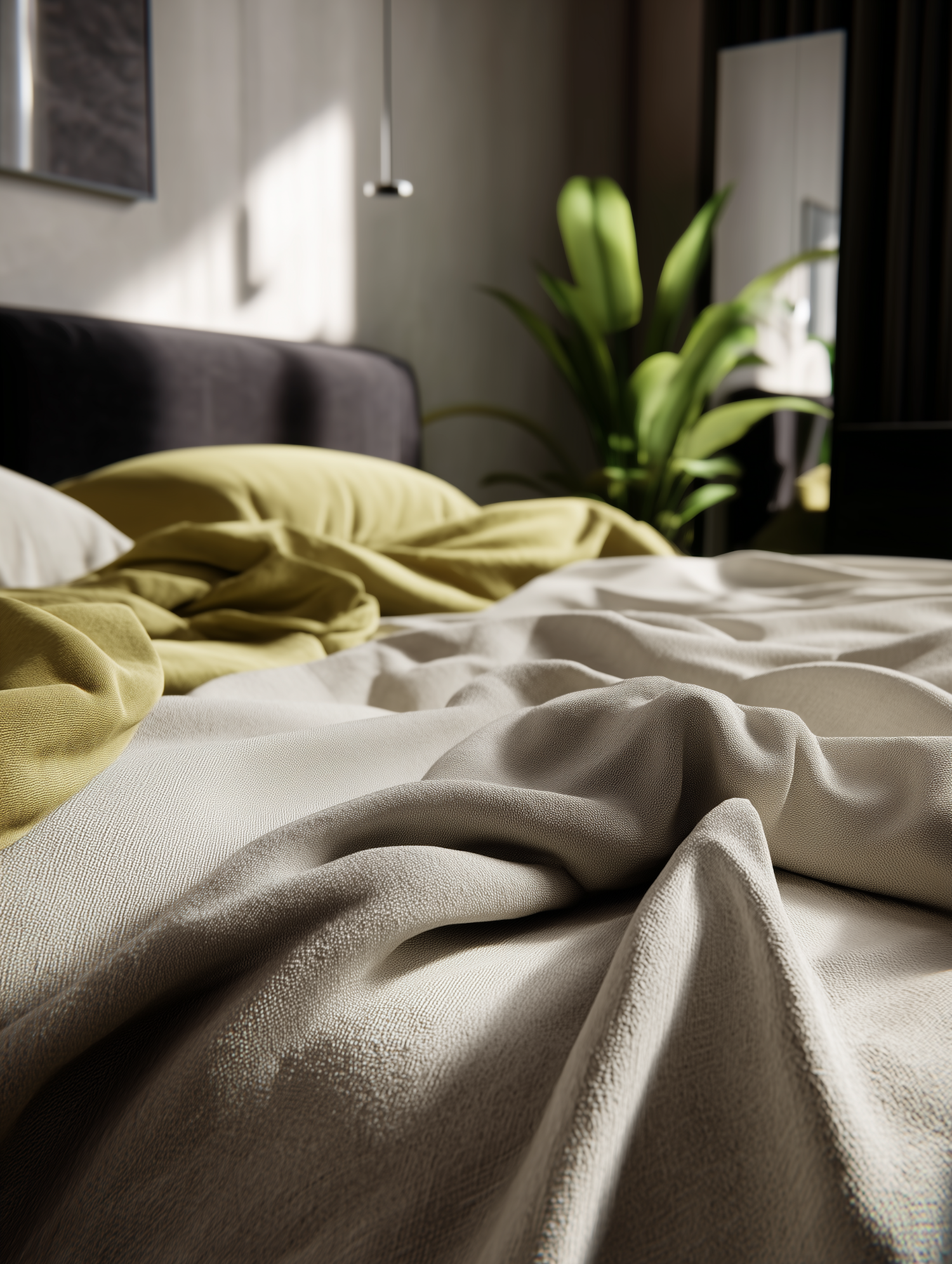 Soft beige and olive-green bedding in a cozy bedroom with natural light, a modern headboard, and a lush green plant in the background.