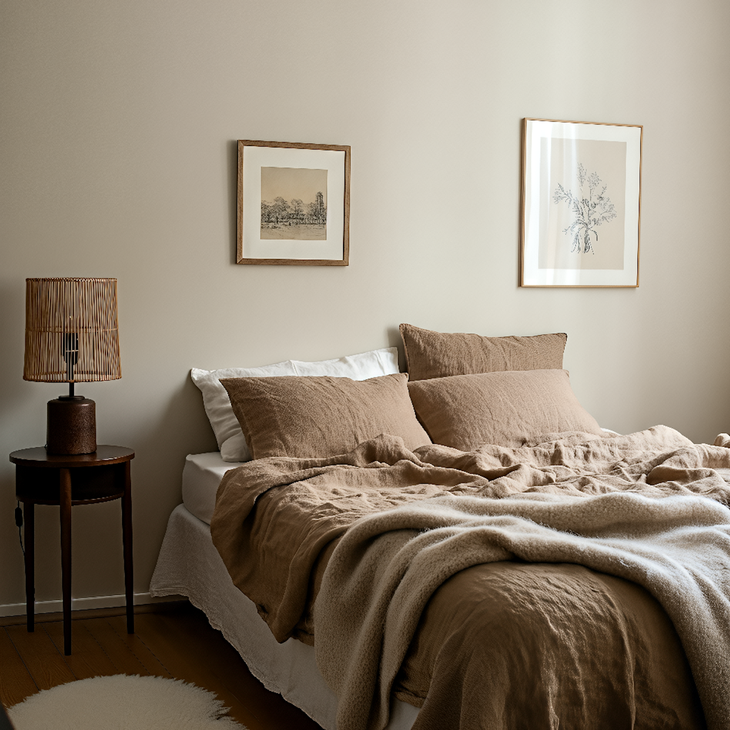 A cozy bedroom with beige and brown linens, framed wall art, and a wooden side table with a woven lamp, creating a warm and inviting space.
