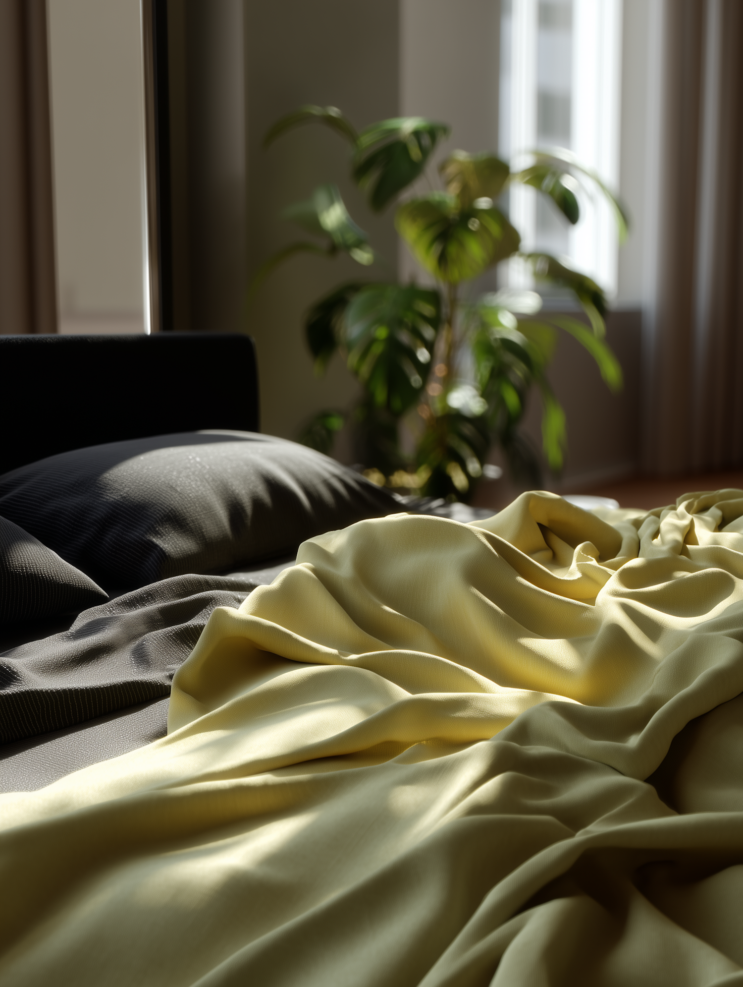 Sunlit bedroom with a crumpled yellow blanket, black pillow, and a lush green plant in the background. Cozy and serene vibes.