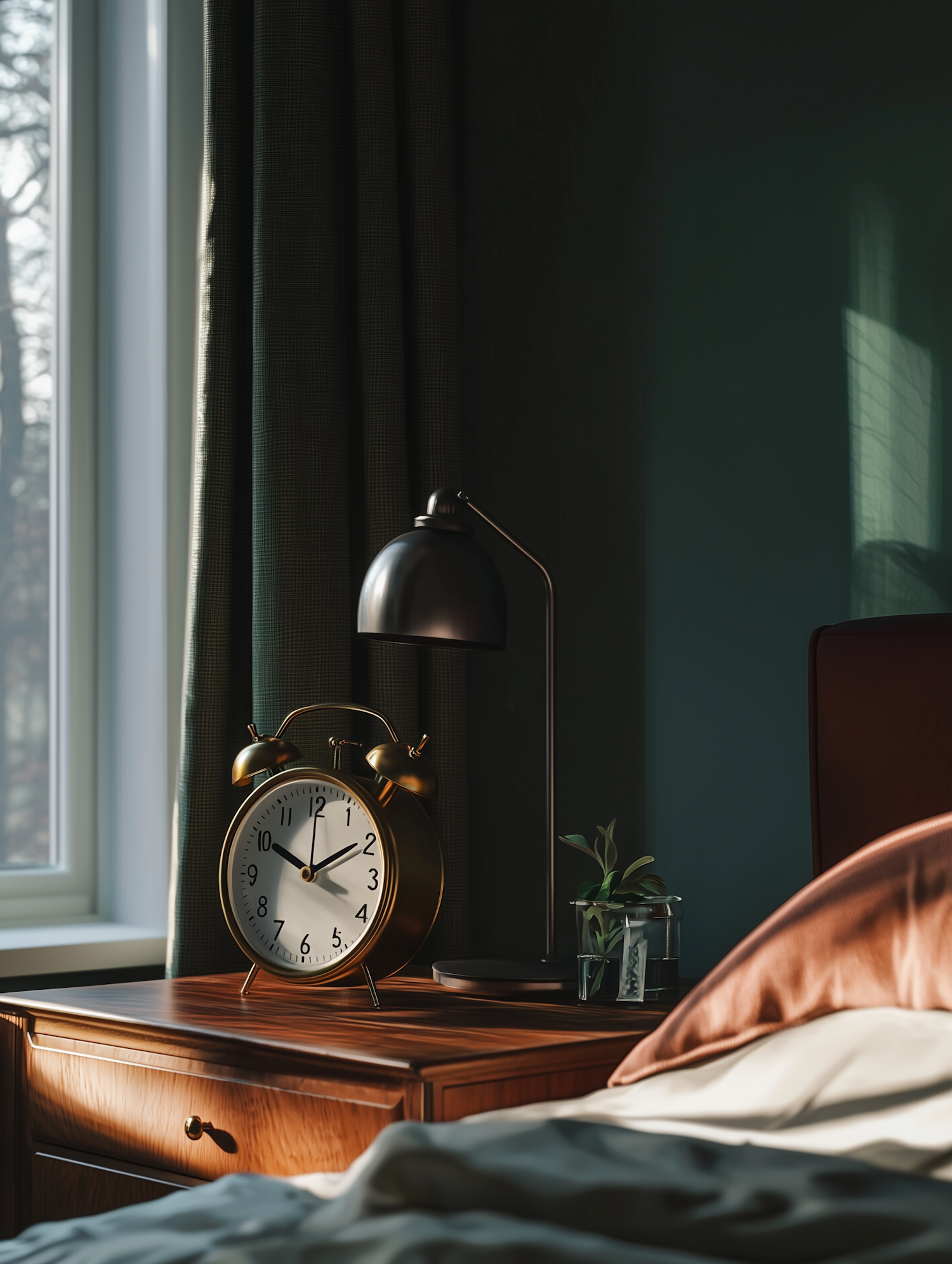 A cozy bedroom setup with a vintage alarm clock, sleek lamp, and green plant on a wooden nightstand by a sunlit window.