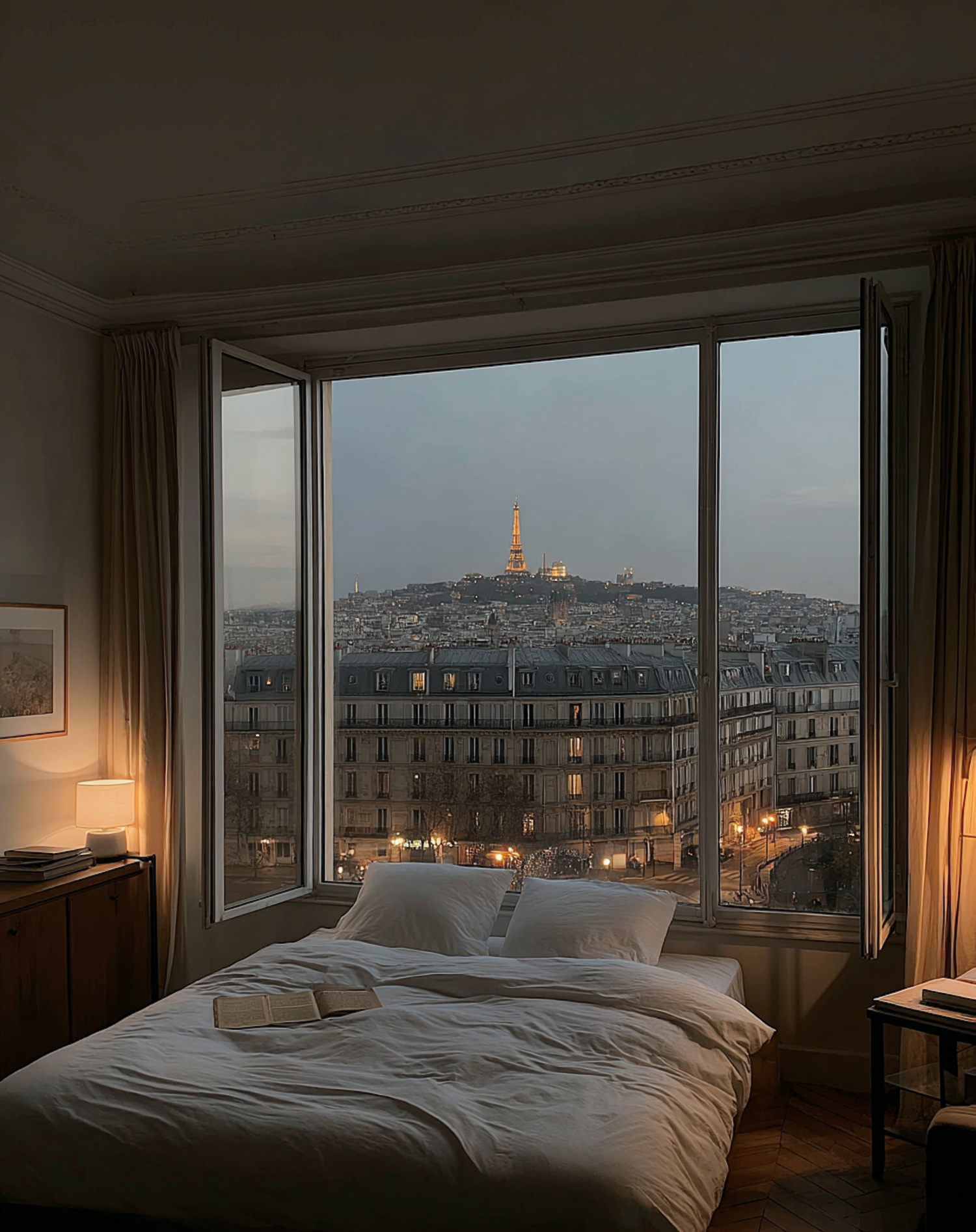 A cozy bedroom with a view of the Eiffel Tower at dusk, featuring warm lighting, white linens, and an open book on the bed.