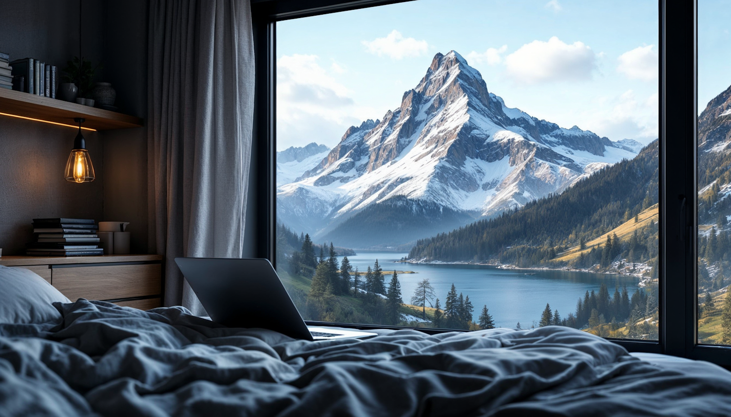 Cozy bedroom with a stunning mountain view, featuring a bed, books, and a laptop. Perfect blend of relaxation and nature.