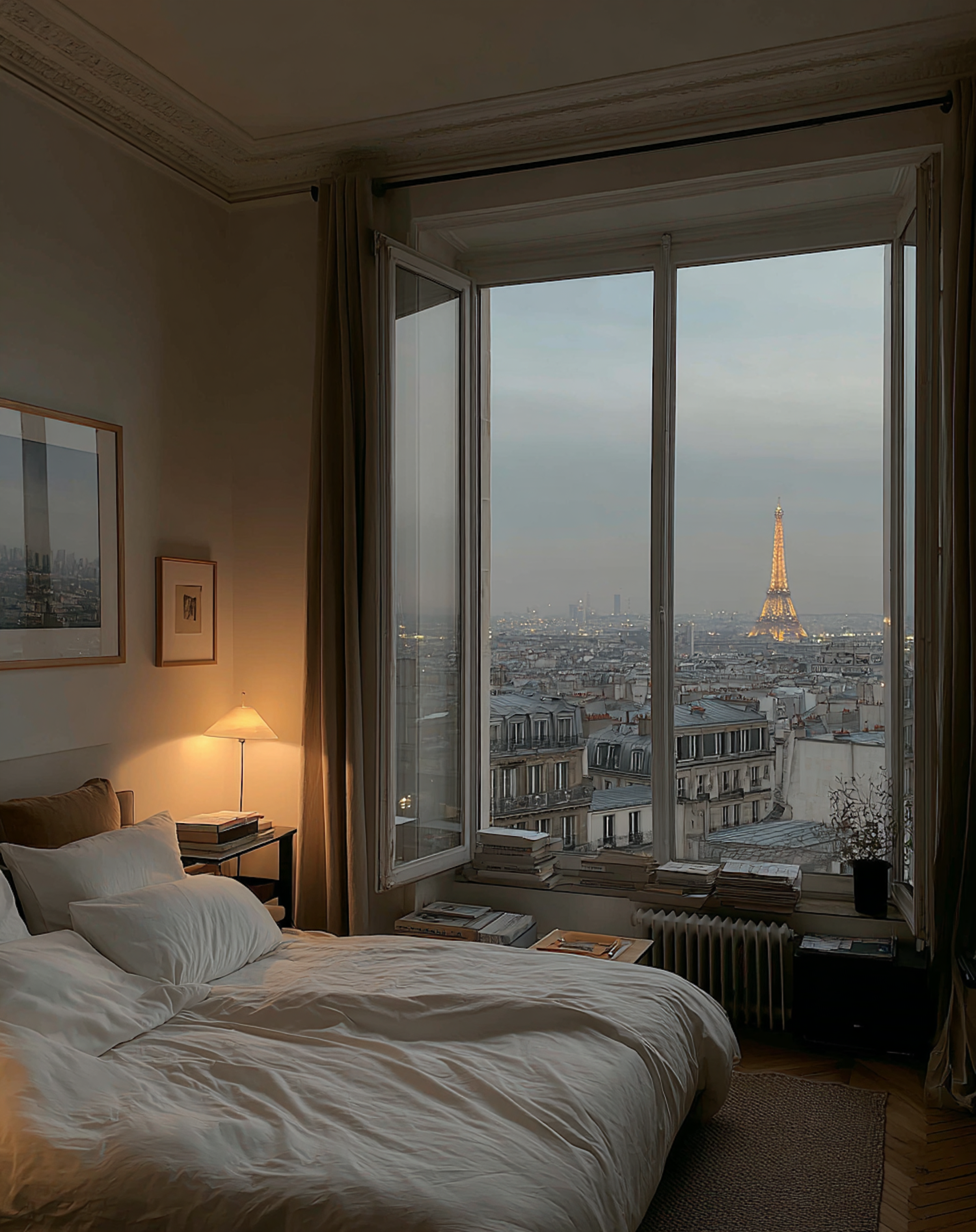 A cozy bedroom with a view of the Eiffel Tower at dusk, featuring warm lighting, white linens, and a serene ambiance.