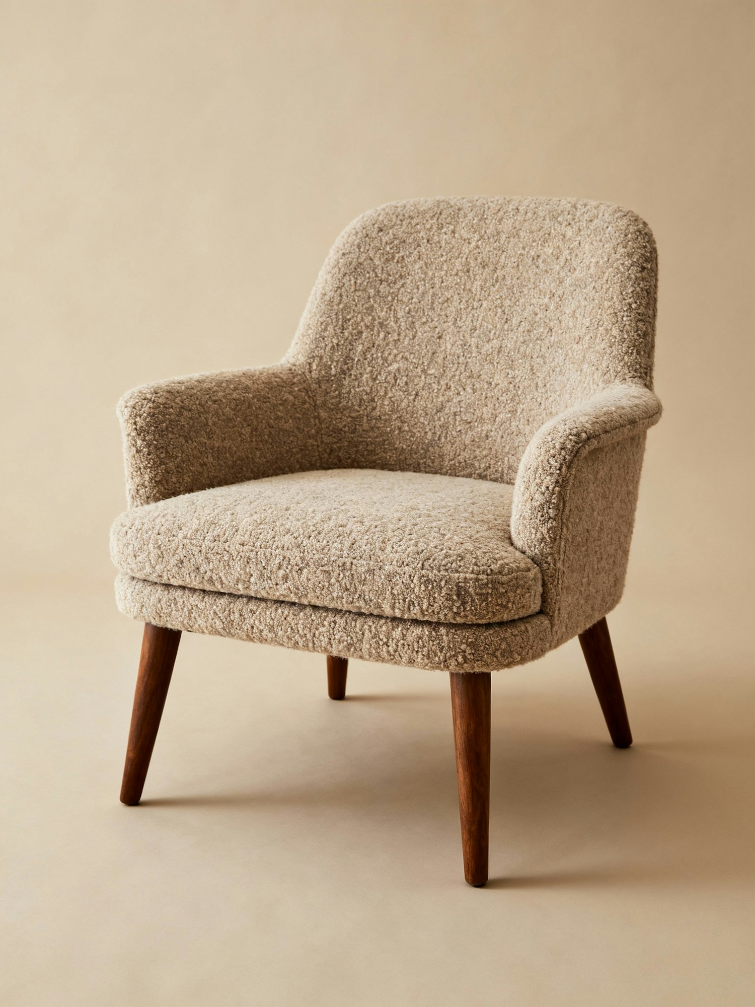 Professional interior design photography, warm and textured atmosphere, soft natural lighting, retro-modern aesthetic, mid-century inspired furniture, crafted wooden details, neutral tones with accents of earthy colors, editorial style, timeless and sophisticated mood. Isolated armchair photographed from the front on a plain beige background. The chair features walnut wooden legs and boucle fabric upholstery. Studio photo with neutral lighting emphasizes the overall silhouette and proportions.