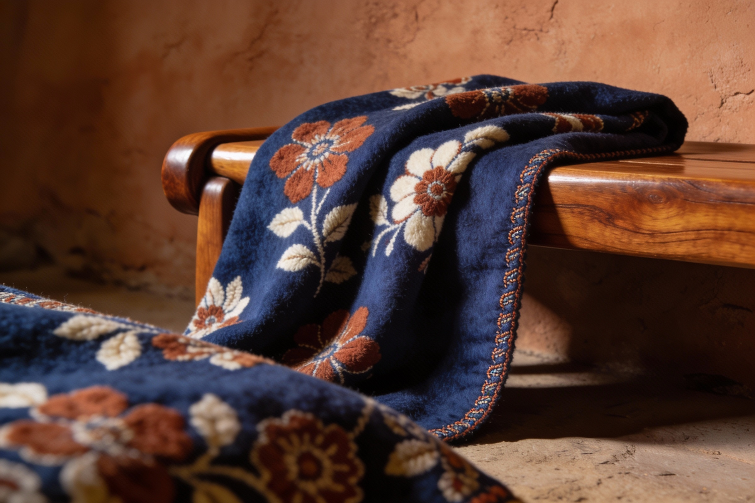 A folded throw in rich indigo with terracotta and cream floral motifs rests over the arm of a warm walnut wood bench. The fringe is replaced with a subtle embroidered edge. The backdrop is a textured clay wall, creating a grounded, earthy palette that evokes artisanal depth.