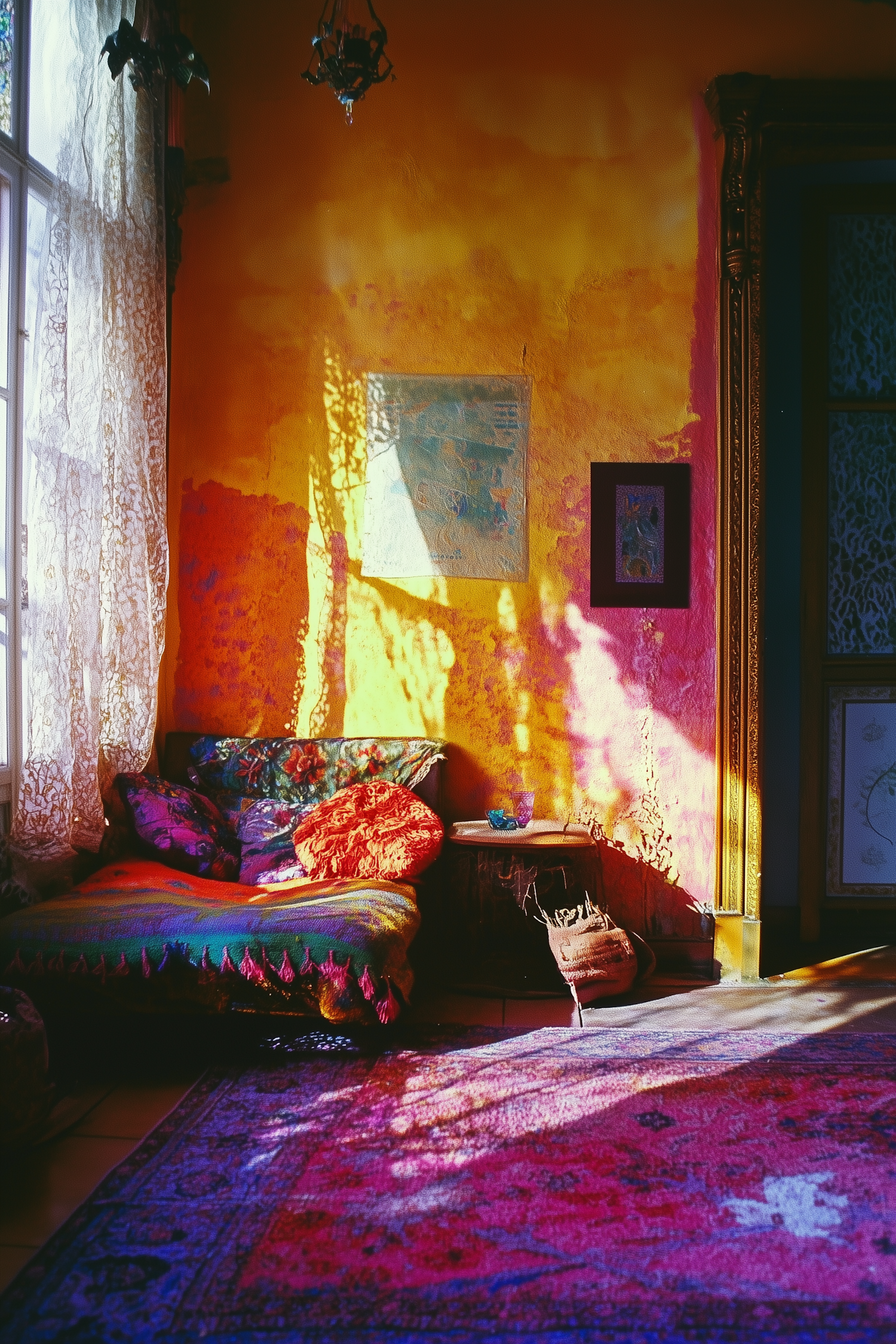 Vibrant bohemian room with colorful cushions, warm sunlight, and eclectic decor. Orange and pink walls create a cozy atmosphere.
