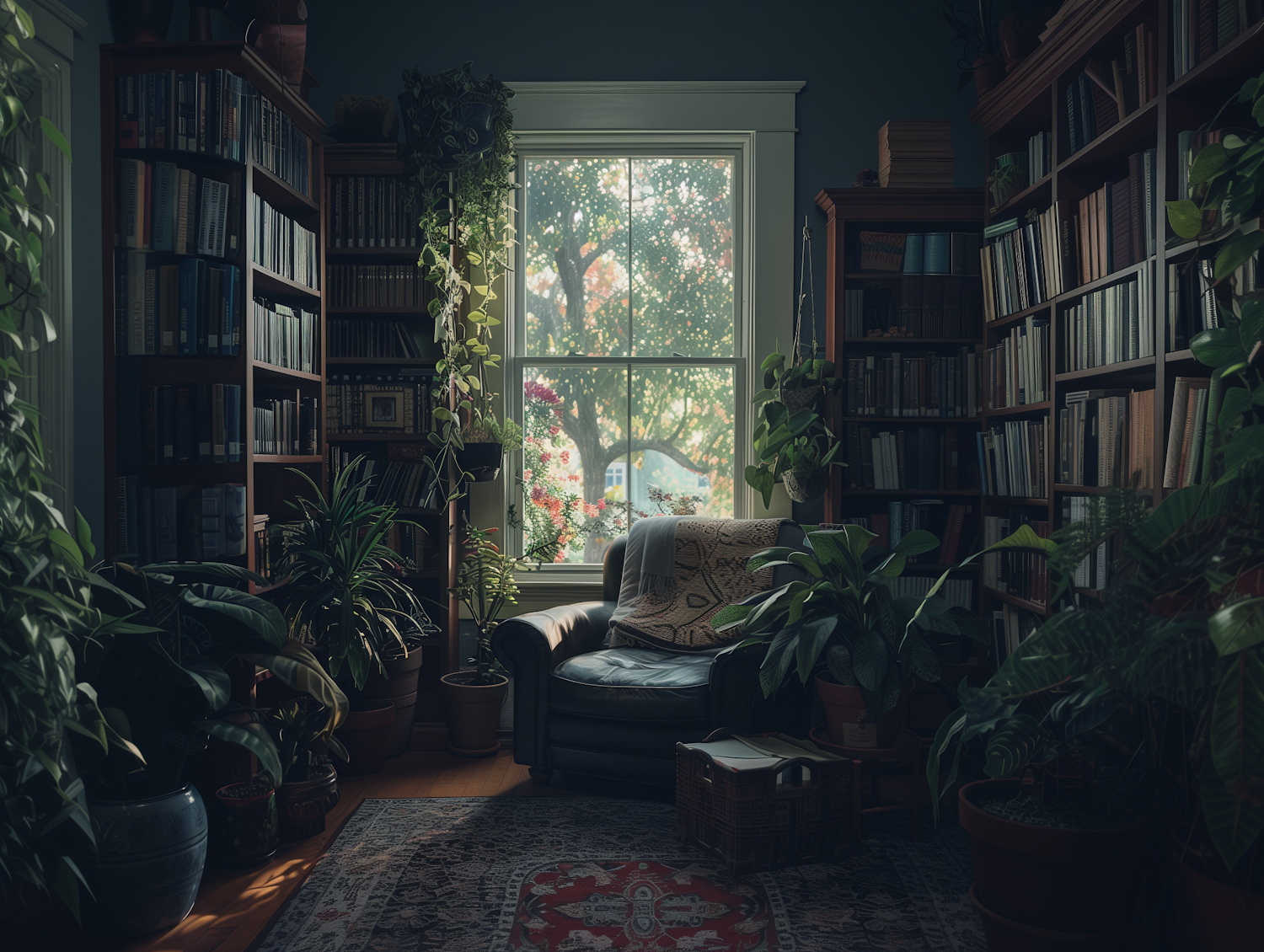 Cozy reading nook with bookshelves, lush plants, and a comfy armchair by a sunlit window, perfect for relaxation and reading.