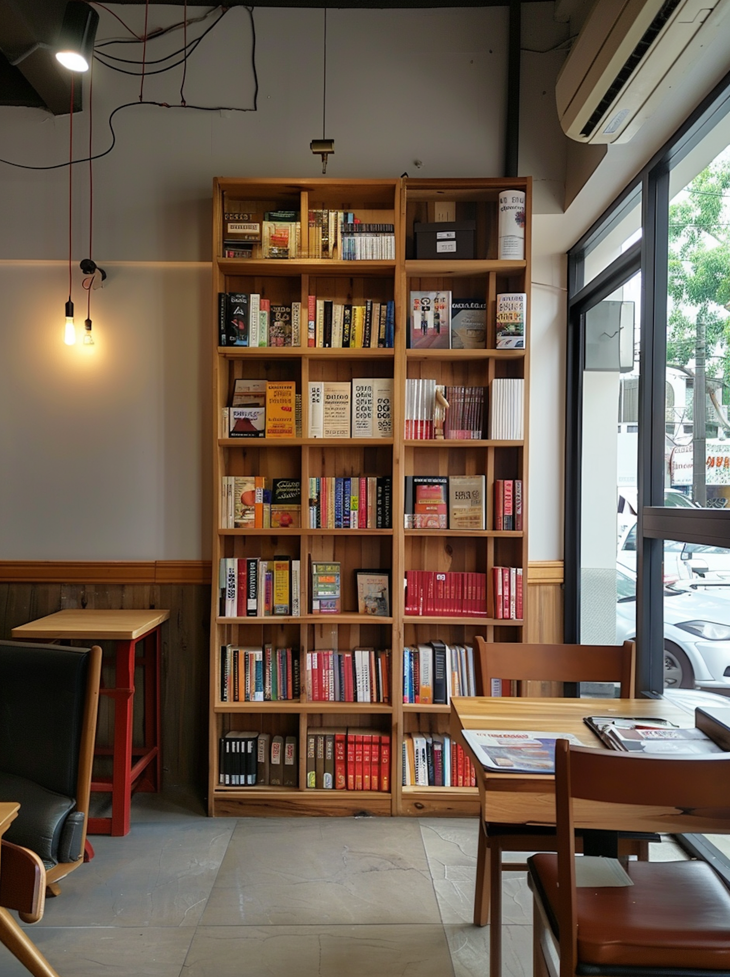 Cozy cafe with a tall wooden bookshelf, warm lighting, and inviting reading spaces. Perfect for book lovers and relaxation.