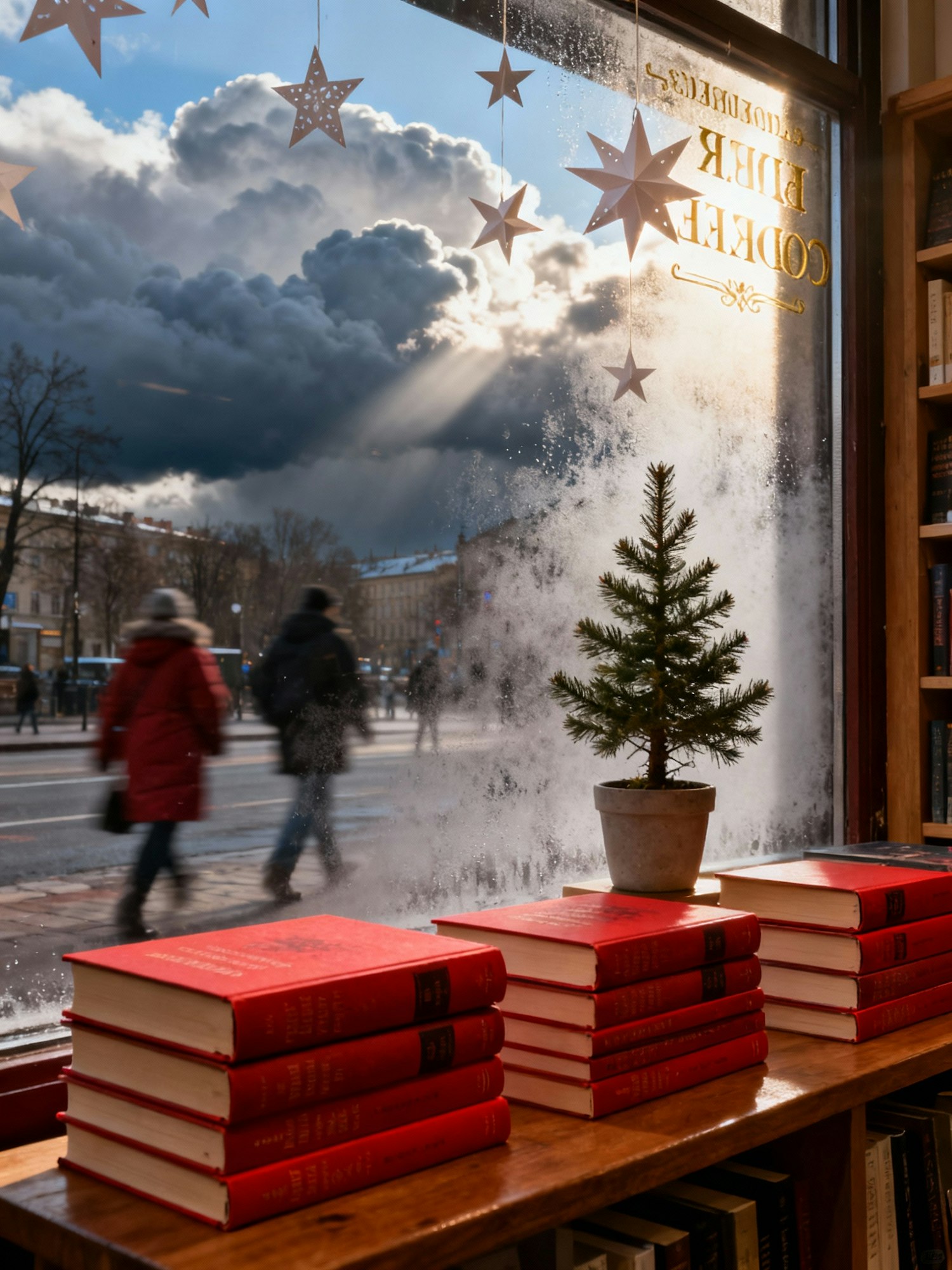 City bookstore corner at street level Inside looking out: fogged display window with cut-paper stars and a tiny spruce; hardcover stacks with red spines; passersby coats blur slightly; clearing storm beyond—cumulus towers, sun shaft clips the gilt lettering on the glass. 24 mm, f/7.1, ISO 100, 1/250 s; CPL (balance interior/exterior reflections). Negative: banding on glass, warped type, smeary pages.