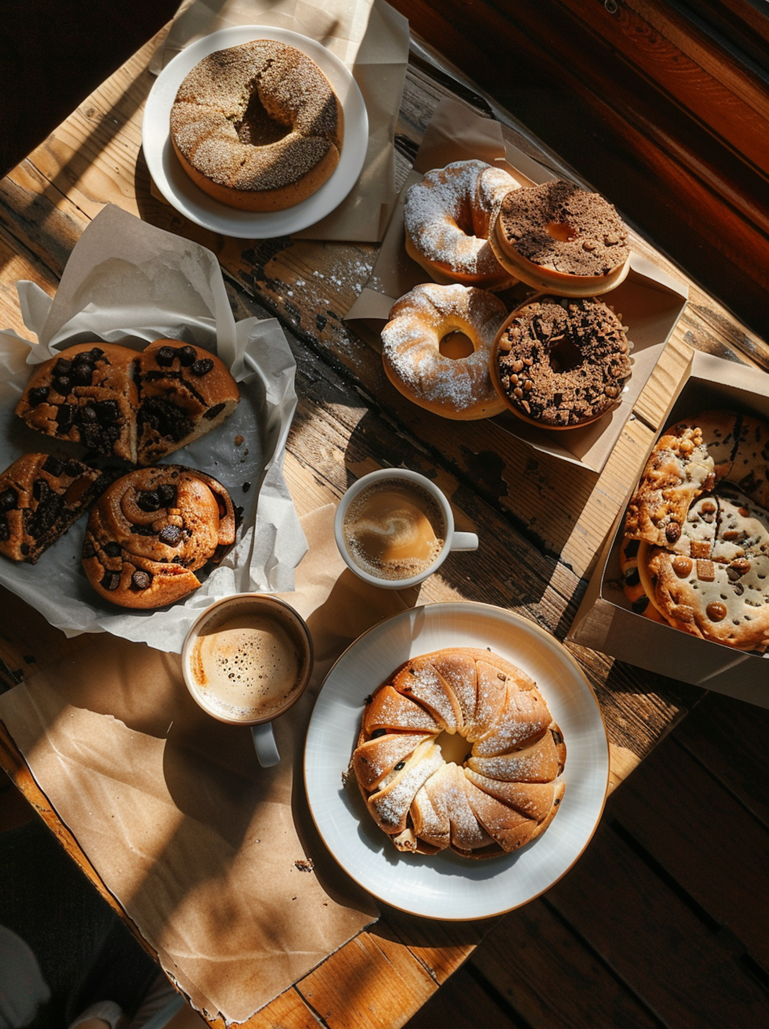 Cozy breakfast scene with coffee and assorted pastries on a rustic wooden table, bathed in warm sunlight.