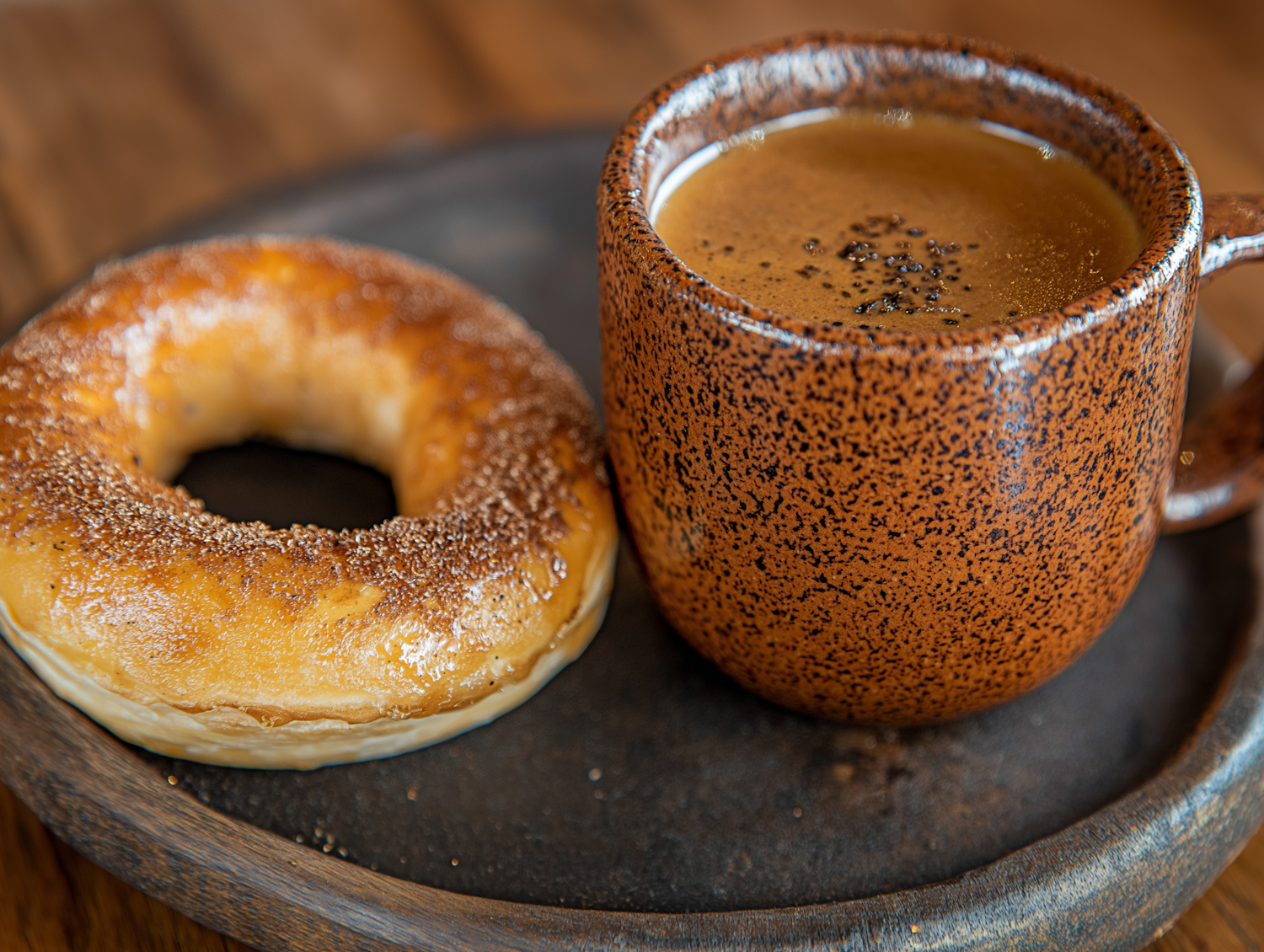 Rustic ceramic mug with coffee and a golden-brown bagel on a wooden tray, creating a cozy and inviting breakfast scene.